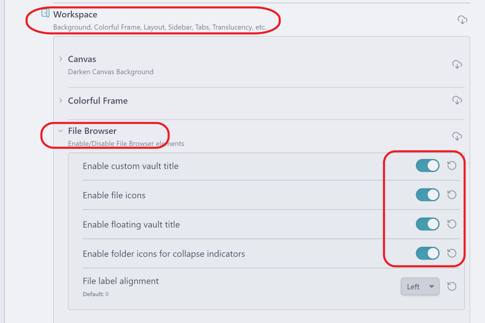 Workspace> File Browser 에서 네개의 항목을 활성화합니다.