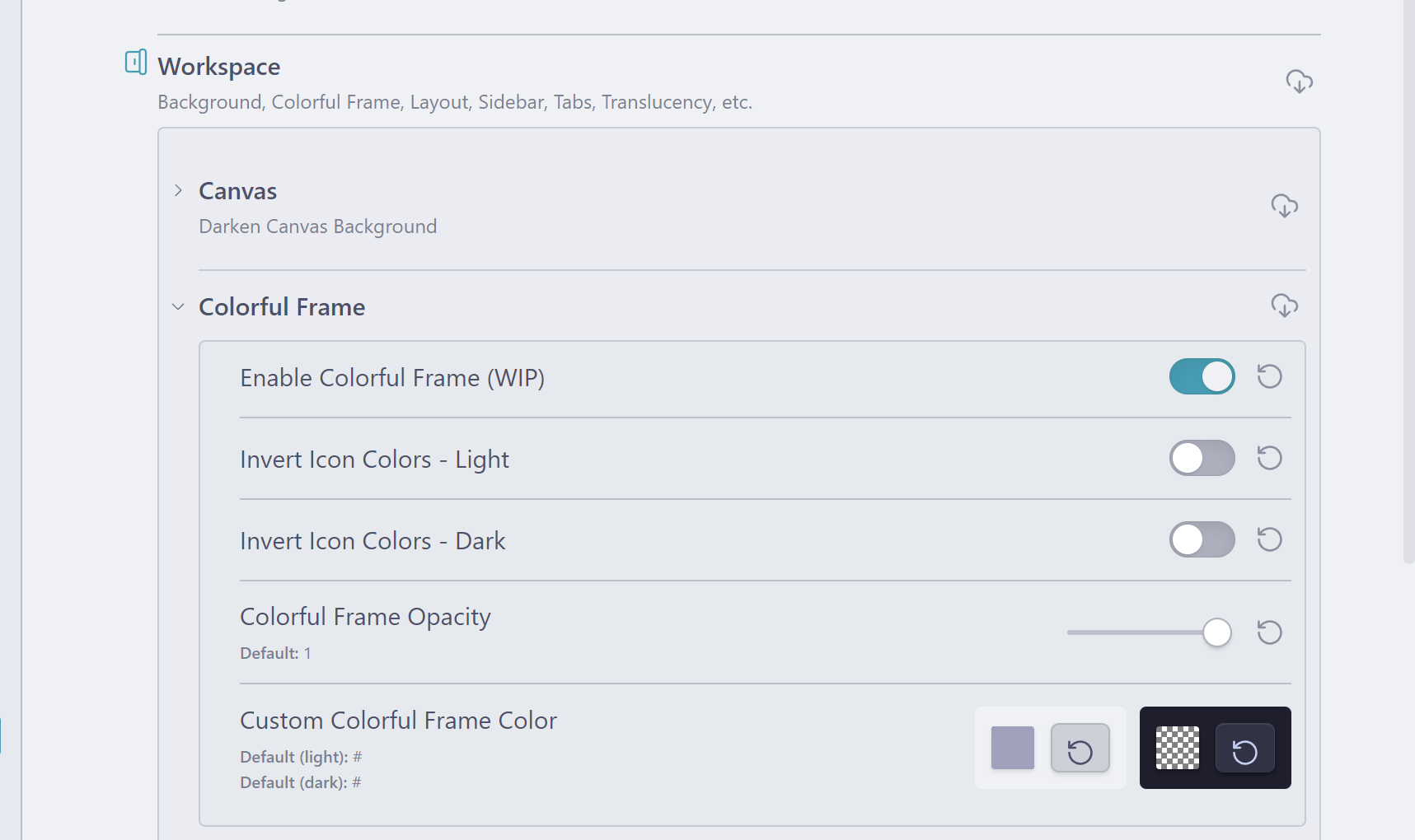 Workspace> Colorful Frame으로 이동하여 첫번째 항목을 활성합니다. 색상조정을 할 수 있습니다.