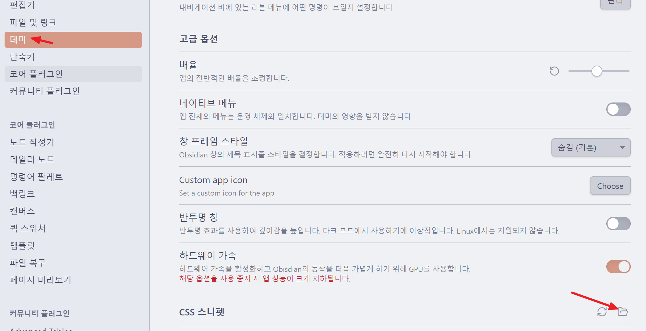 설정 > 테마 > CSS 스니펫 으로 이동한 후에 폴더 열기 아이콘을 선택합니다.