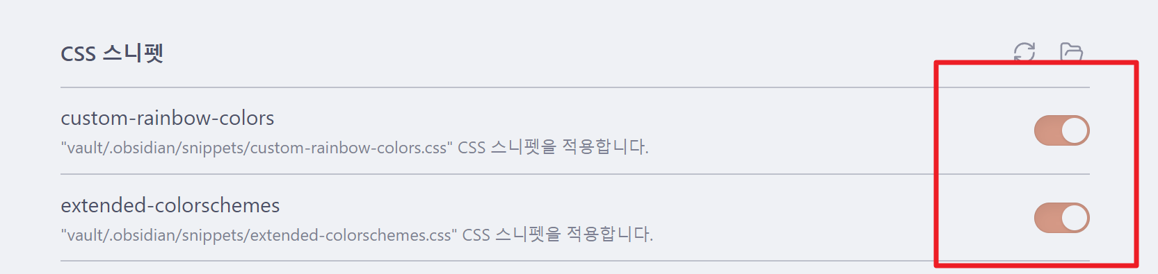 CSS 스니펫에 두개의 항목이 보여지게 됩니다. 우측 버튼을 활성 상태로 변경합니다.