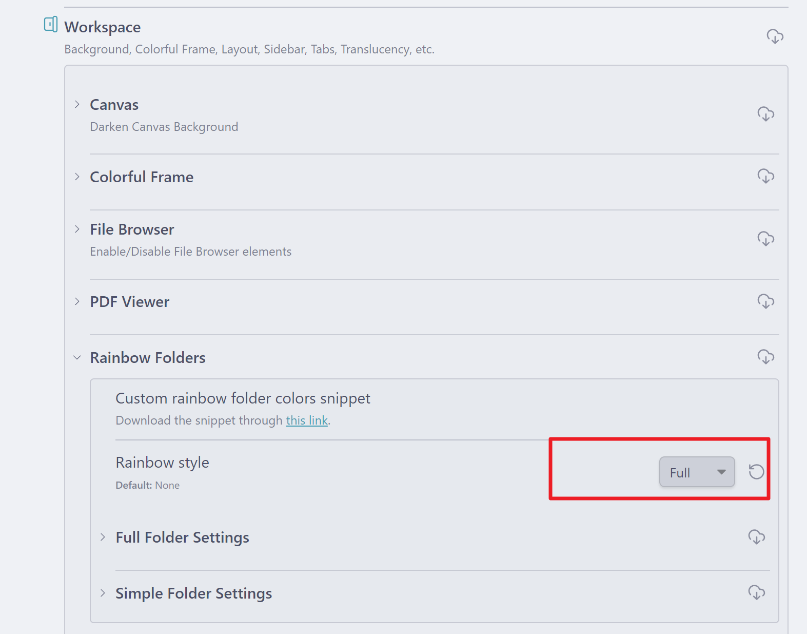 Workspace> Rainbow Folders 로 이동하여 Rainbow Sytle를 Full로 변경합니다.