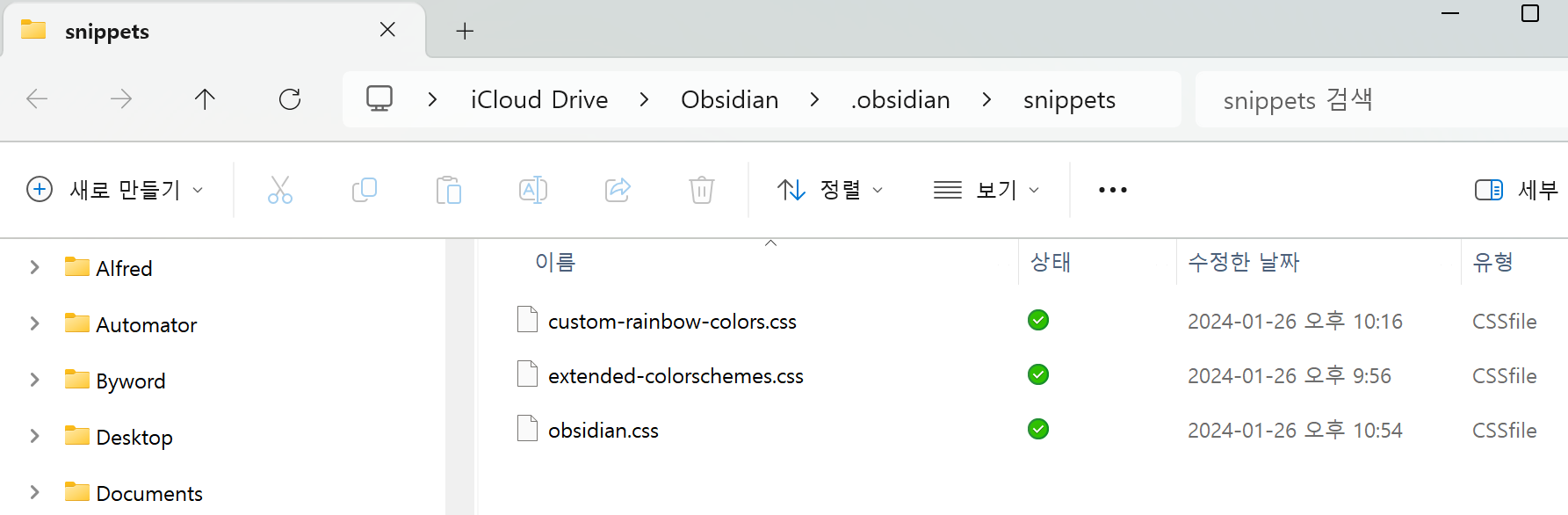 다음과 같이 파일 탐색기창이 열리고 이 위치에 다운 받은 두개의 css 파일을 이동시킵니다. 그리고 폴더를 닫습니다.