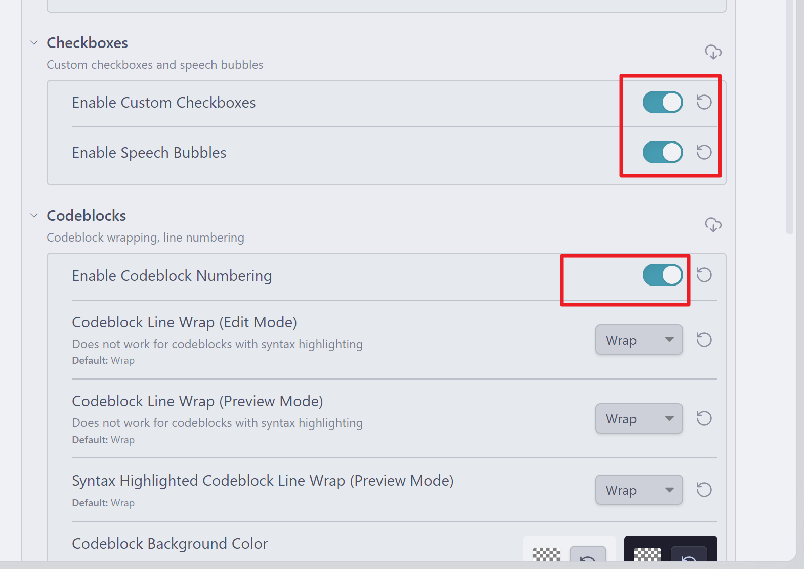체크박스의 두개의 항목을 활성화 하였고 코드 블럭에서는 라인 넘버링을 활성화 했습니다.