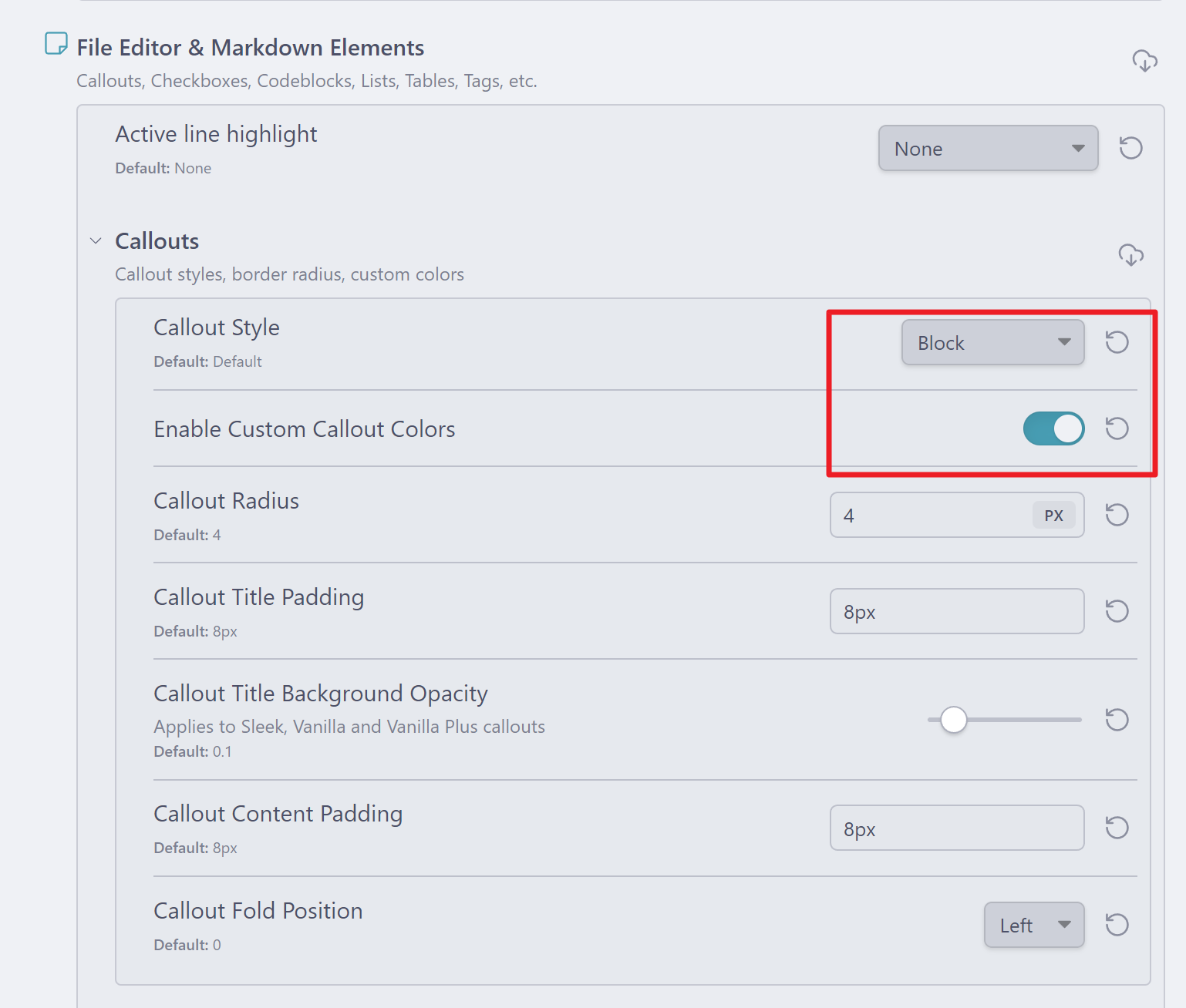 File Editor & Markdown Elements에서 Callouts 항목을 다음과 같이 변경합니다.