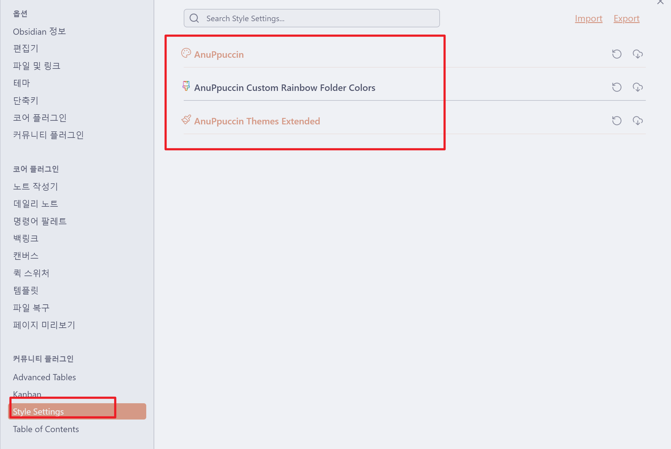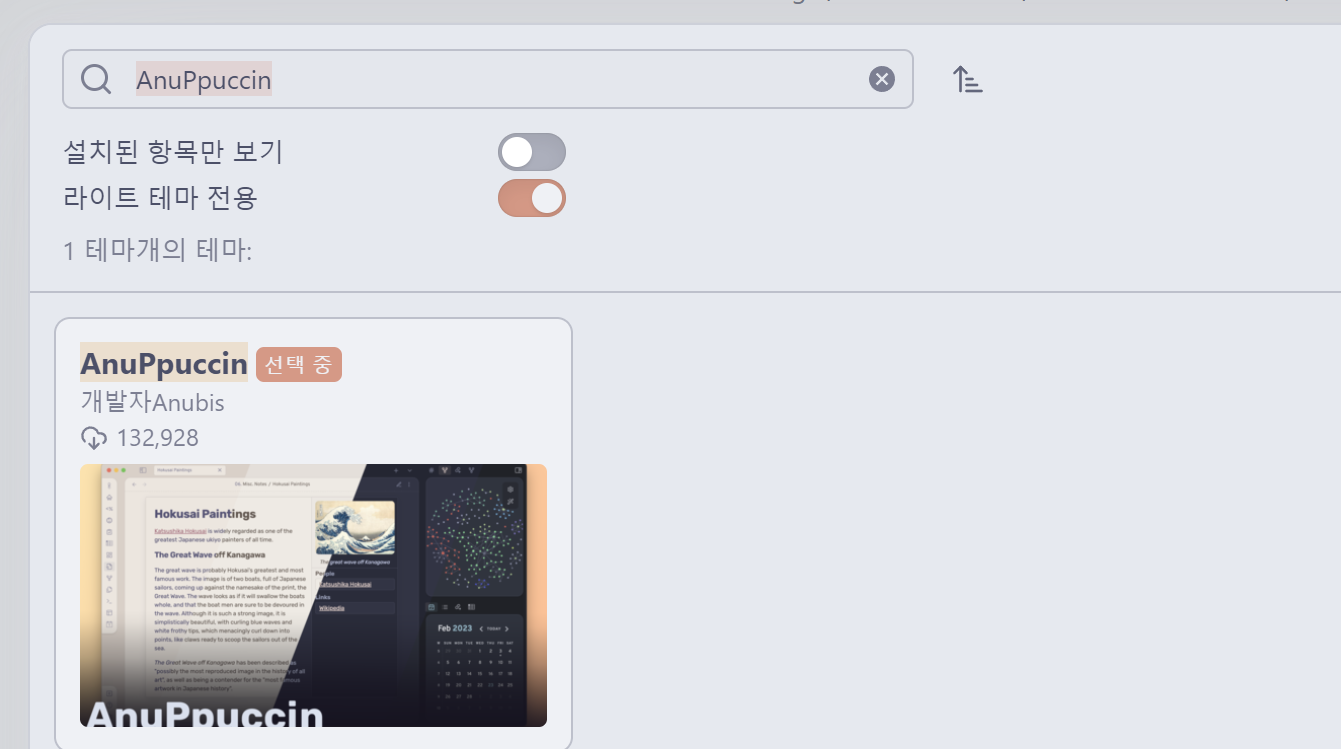 AnuPpuccin 테마를 적용하기 위하여 1개의 테마와 1개의 커뮤니티 플러그인 그리고 두개의 CSS 스니펫을 설치할 것입니다.