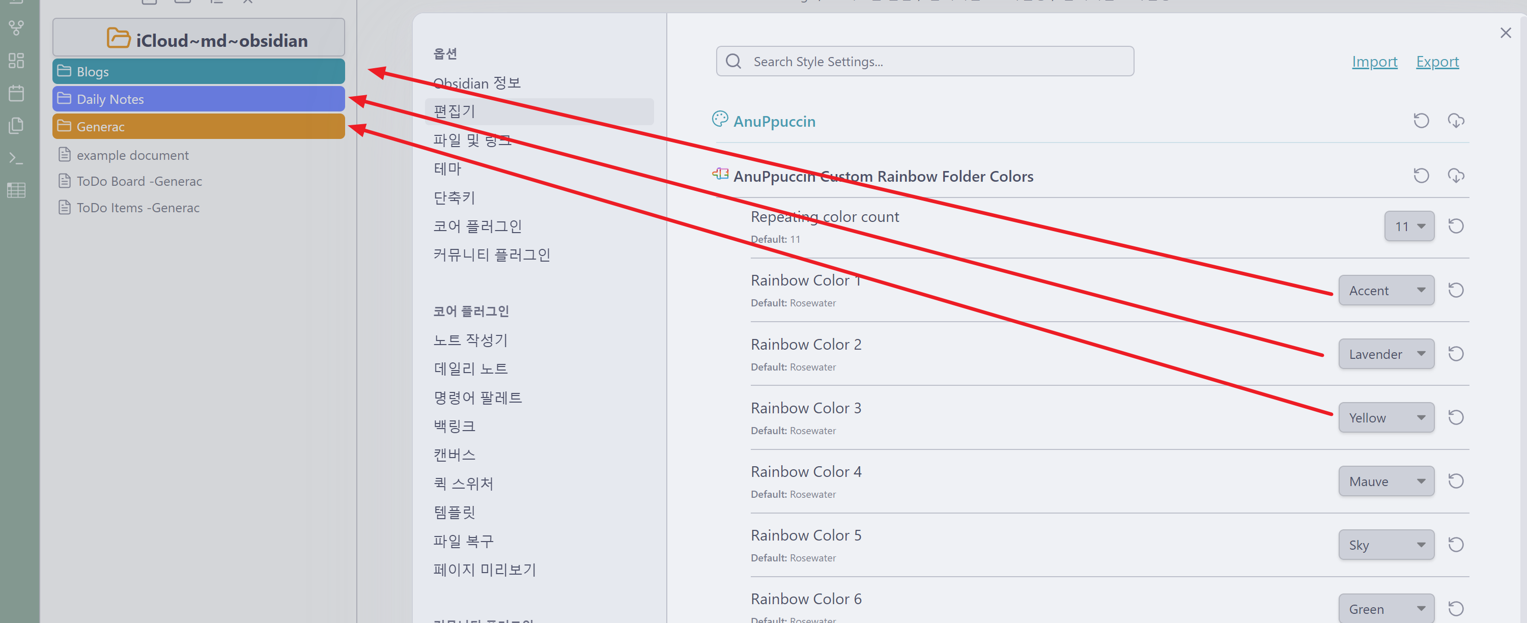 AnuPpuccin Custom Rainbow Folder Colors에서 각 폴더의 색상을 변경합니다.