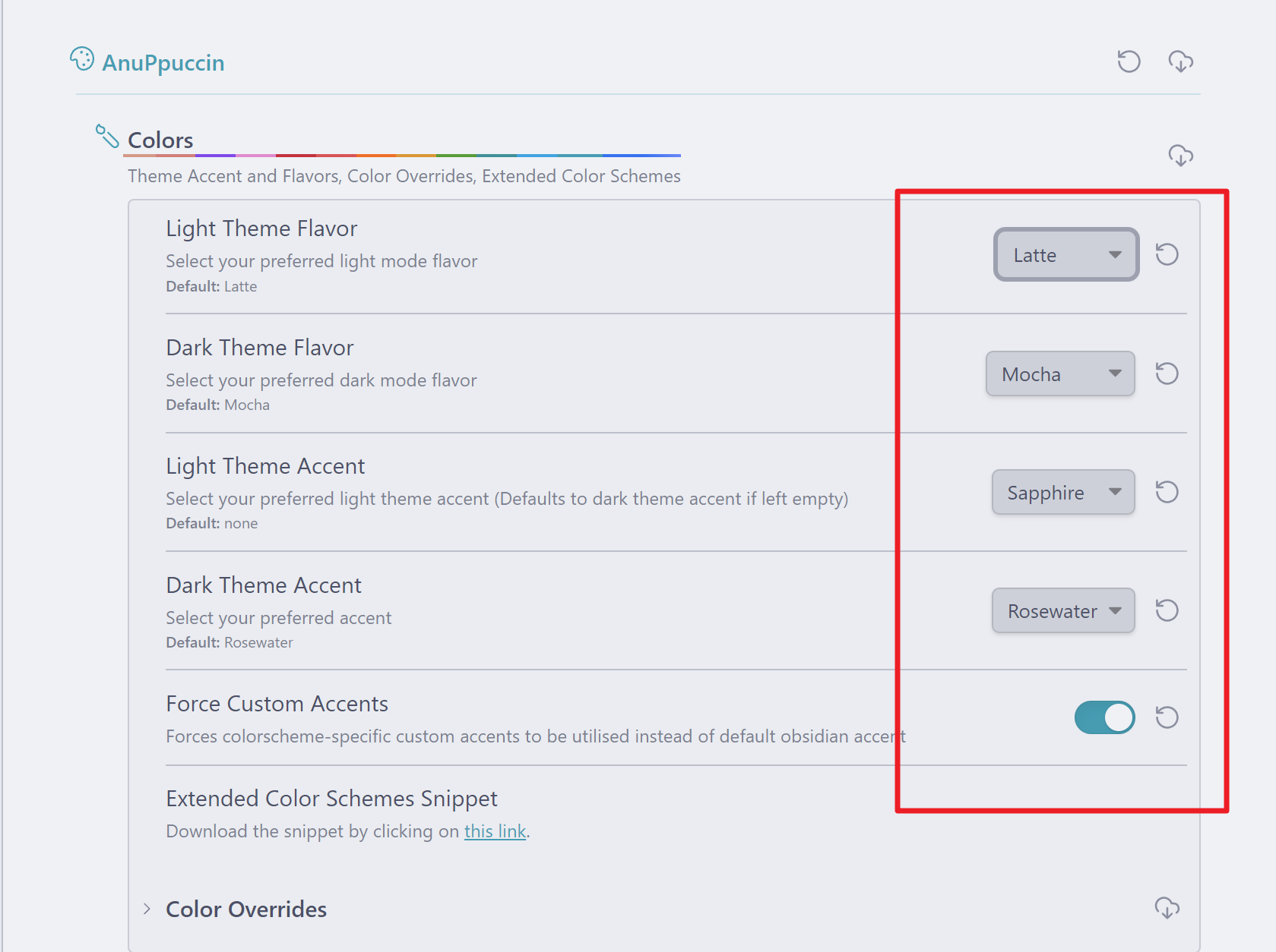 AnuPpuccin 항목의 Colors를 선택하고 다음과 같이 설정을 변경하였습니다. 각각의 컬러는 하단의 Color Overrides 메뉴에서 변경할 수 있습니다.
