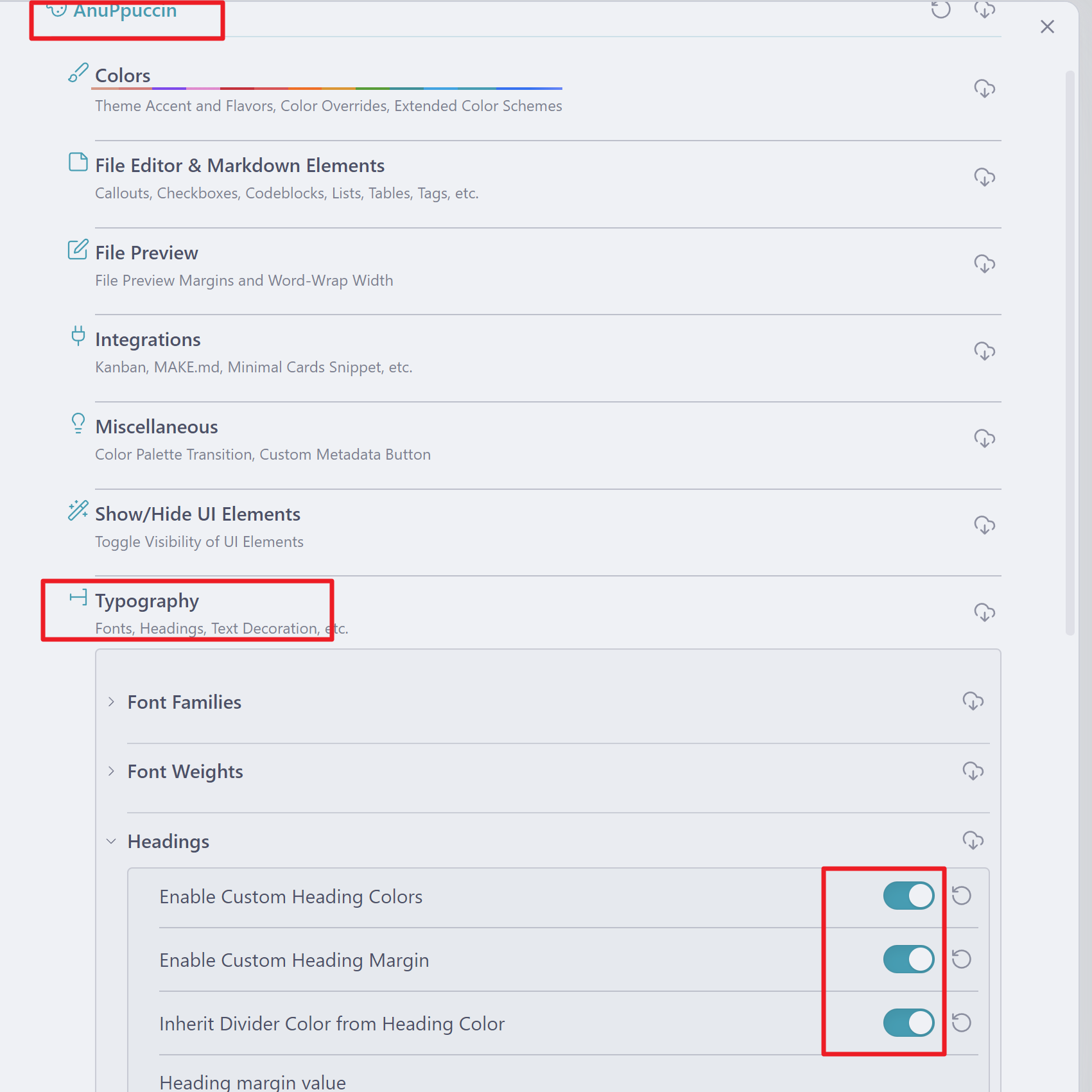 Typography >Headings로 이동하여 세개의 항목을 활성화합니다. 색상 변경을 포함한 세부적인 사항들을 설정할 수 있습니다.