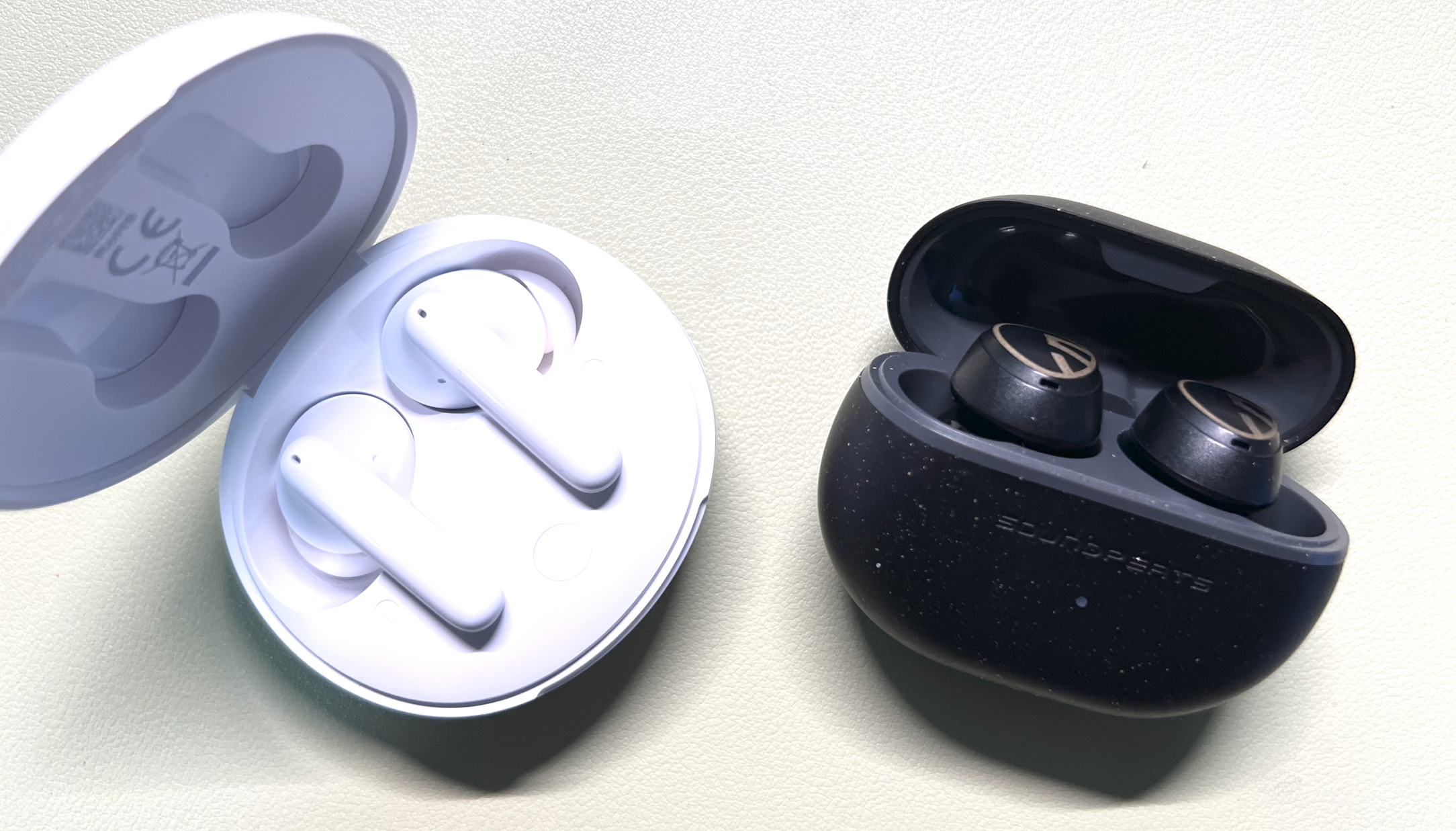 왼쪽이 QCT T13 ANC2이고 오른쪽은 사운드비츠 미니 프로 HS 모델입니다.
