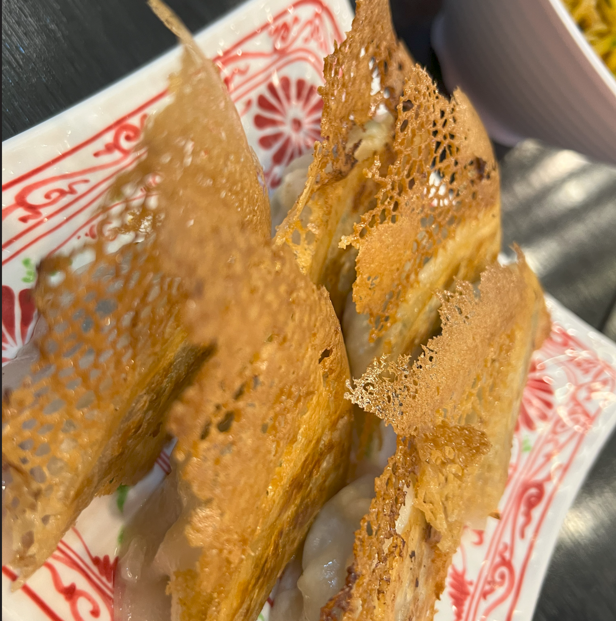 고기만두는 중국식 육즙 만두이고, 부추 만두는 계란을 추가하였습니다. 만두피를 한국 스타일로 얇게 만들어 중국 만두 특유의 텁텁함을 없앴습니다. 모두 새우가 들어있습니다.
