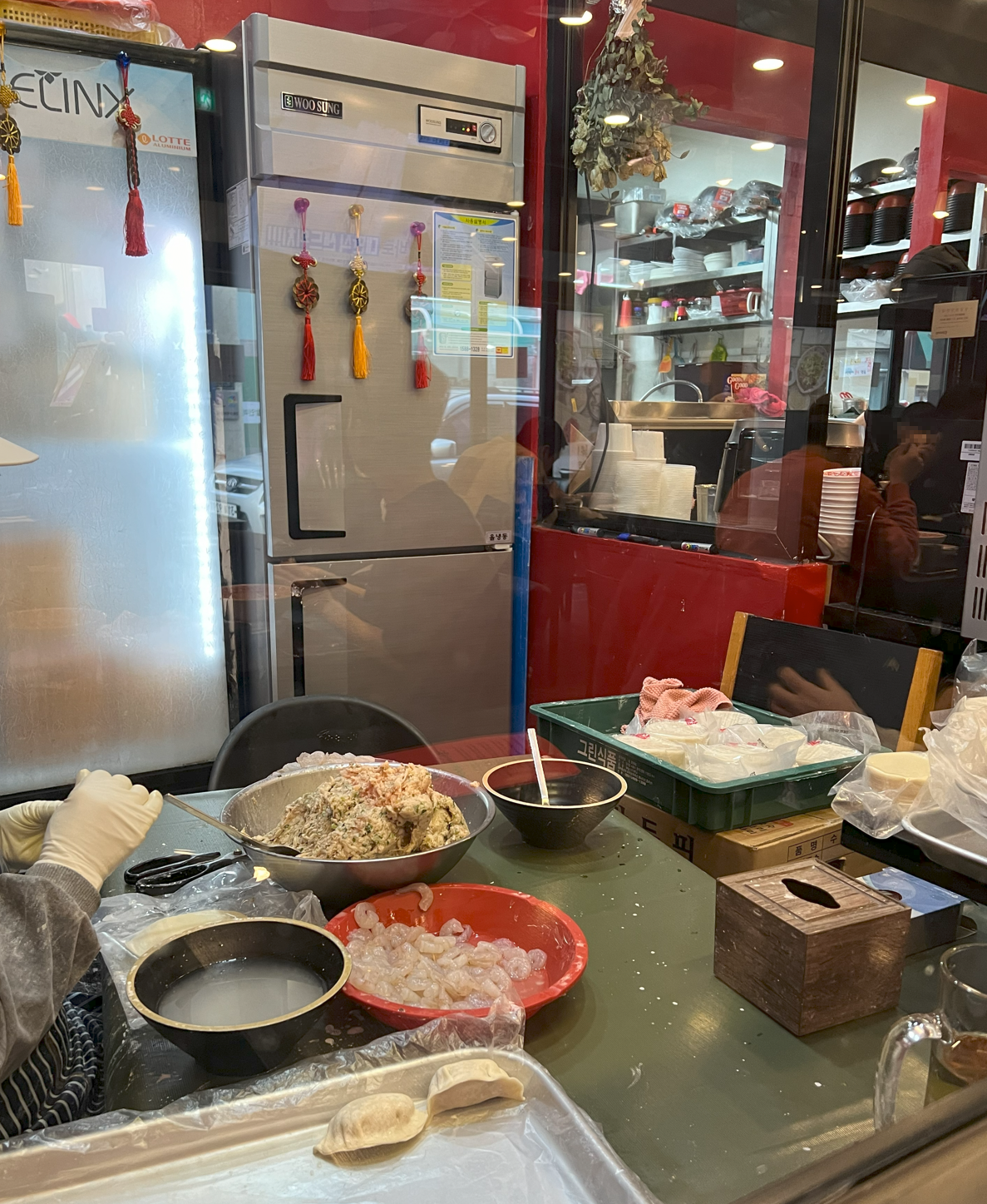 옆의 유리 부스안에서는 아주머니들이 열심히 만두를 빚고 계시네요. 통새우가 들어가는 모습을 볼 수 있습니다.