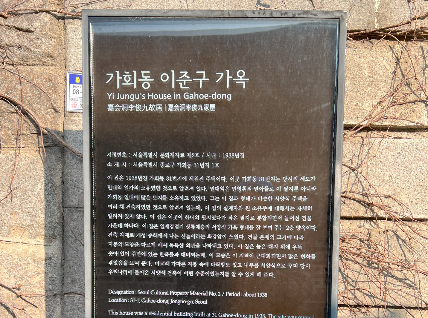 취운정 터에서 맹현으로 가는 길로 들어서면 양옥의 대저택들이 나온다. 왼쪽 길 초입엔 높은 축대 위 담장 너머로 오래된 서양식 건물의 지붕만 보이는데. 화강암을 벽돌처럼 쌓은 돌집으로 지붕엔 뾰족한 삼각형 박공이 돌출되어 있다. 이 집이 서울시 문화재자료로 지정된 '가회동 이준구 가옥'이다. 이 집은 1938년 무렵에 지어진 것으로 일제강점기 상류계층의 서양식 가옥 형태를 잘 보여주는 2층 양옥이다. 건축 자재로는 신돌이라는 화강암이 쓰였다고 한다. 내부는 서양식으로 꾸며져 있고 다락방도 있다고 하는데 비공개 건물이라 볼 수는 없다. 이 집은 민영휘의 아들 민대식 일가의 소유였고 일대에 많은 토지를 소유하고 이 집과 비슷한 서양식 주택을 여러 채 건축했다고 한다.
