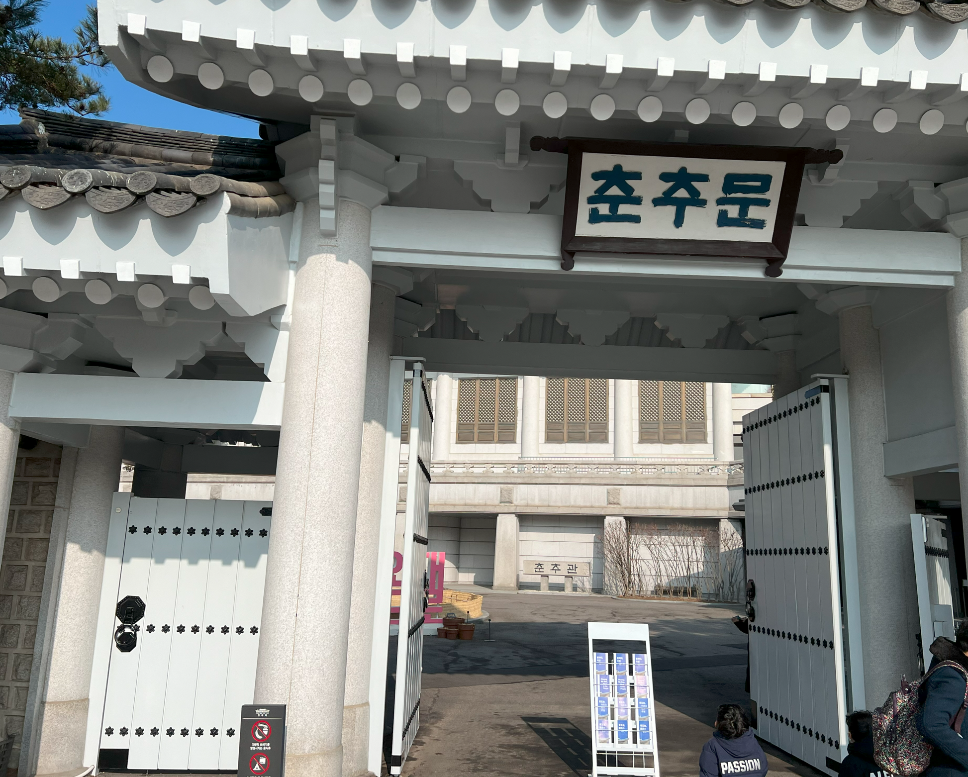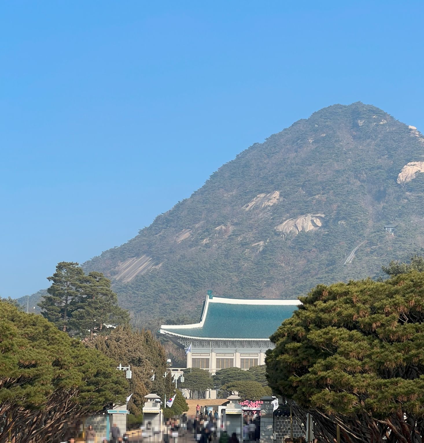 조금만 더 걸으면 청와대 정문에 도달합니다. 경복궁을 거쳐 청와대를 보는 많은 중국 단체 관광객을 볼 수 있습니다. 시장터 같습니다.
