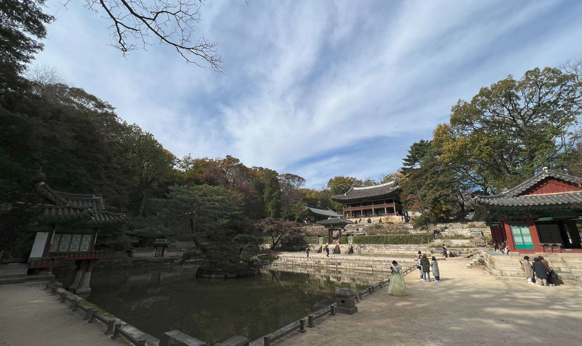 제일 먼저 부용지에 도착하게 됩니다.부용지는 연못인데 부용정, 영화당, 주합루의 세 건물이 함께합니다. 부용지는 사각형 연못과 그 가운데에 원형의 섬으로 구성돼 있습니다. 부용지와 부용정은 조선시대의 천원지방 사상을 반영한 것으로, 하늘은 둥글고 땅은 네모나다는 의미를 담고 있습니다. 부용지와 부용정은 2012년에 보물로 지정되었습니다