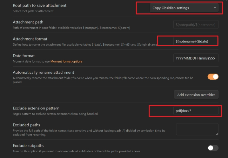 • Root path to save attachement는 옵시디언 기본 설정을 따르도록 했습니다.