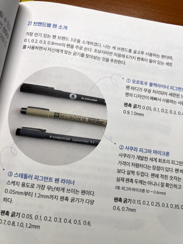 도입부에는 펜 드로잉에 필요한 여러가지 도구들과 재료들을 설명해줍니다. 개인적으로 많은 도움을 받았습니다. 피그마 펜이라는 것도 알게되었네요. 만년필은 기본적으로 수성입니다. 그림을 그린 후 마커펜으로 칠하면 만연필로 그린 밑그림이 퍼져 버립니다. 피그마 펜들 처럼 방수 유성 펜들은 이를 방지해줍니다. 특히 얇은것부터 두꺼운 것 까지 다양한 두께의 제품들이 있습니다.