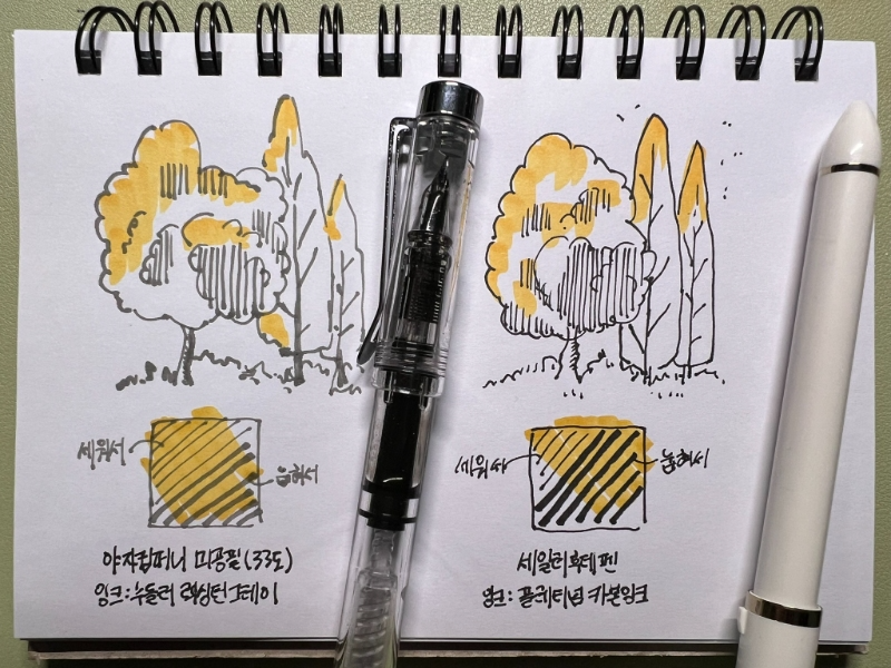 좌측은 야자 컴퍼니 미공필(33도)이고 우측은 세일러 후데 만년필입니다. 잉크는 좌측은 누들러의 렉싱턴 그레이고 우측은 플레티넘 카본 잉크입니다. 두 잉크 모두 색칠을 해도 지워지지 않는 탄탄한 방수력을 지니고 있습니다.