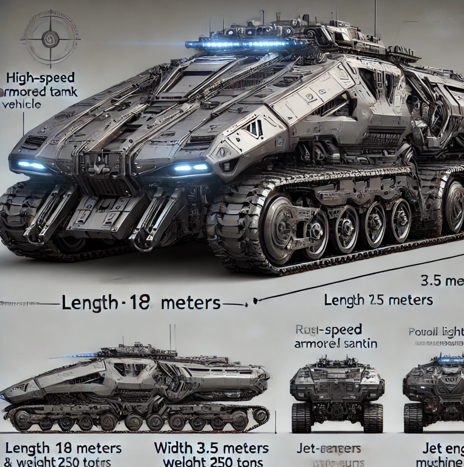 작품속에서 등장하는 순찰차의 사양은 정말 대단합니다. 길이는 18미터, 폭 3.5미터, 높이 4미터이며 무게는 250톤에 입니다. 최대 시속은 900km/h입니다. 차량의 전면에는 1미터 폭의 발광형 조명 모듈로 덮혀있고, 차량 앞부분은 전투용 전차 처럼 둥글게 만들어져 있고 이중 추진 장치 트랙과 연결되어 있습니다. 200톤 크레인을 차체내부에 수납하고 있으며 강력한 기관총도 내장되어 있습니다. 두개의 추진 시스템을 가지면서 평소에는 트랙을 이용하고 초고속 모드에서는 지상에서 살짝 부상하여 제트엔진을 사용합니다.