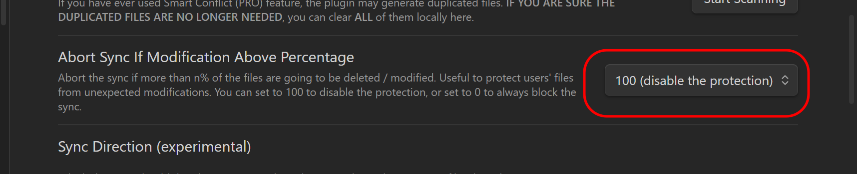 Abort Sync If Modification Above Percentage 는 100을 설정했습니다.
