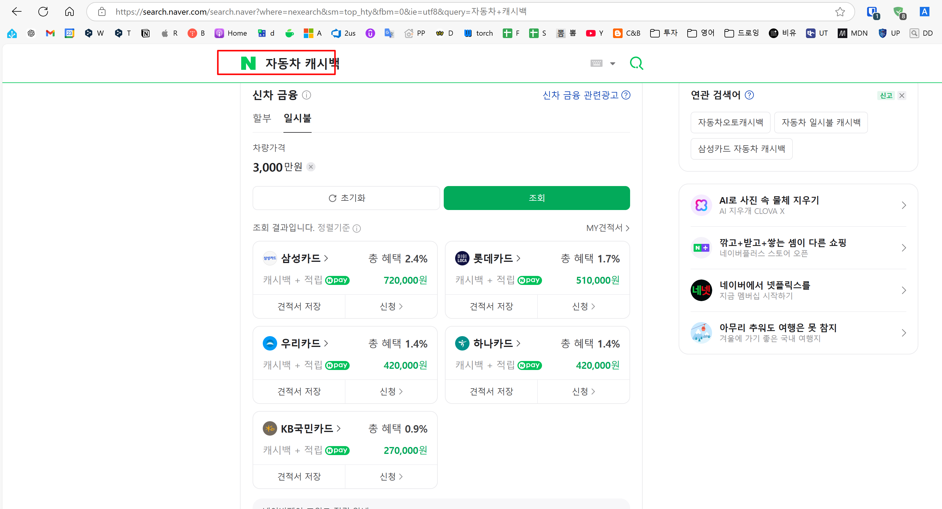 네이버에서도 캐시백 카드사들을 검색할 수 있습니다. 네이버에서 "자동차 캐시백"으로 검색해보세요.