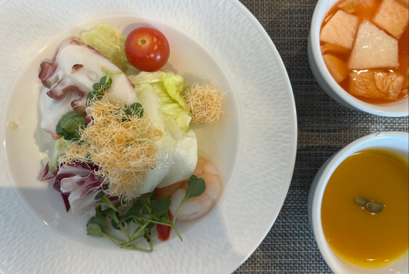 말린 귤을 주전부리도 먹고 있으니 첫번째 요리가 제공됩니다. 호박죽과 동치미 그리고 셀러드와 문어 및 새우입니다. 문어가 신선하고 부드러워서 맛있었습니다. 동치미국도 감칠맛이 좋았습니다. 미각을 돋구는데 제격입니다.