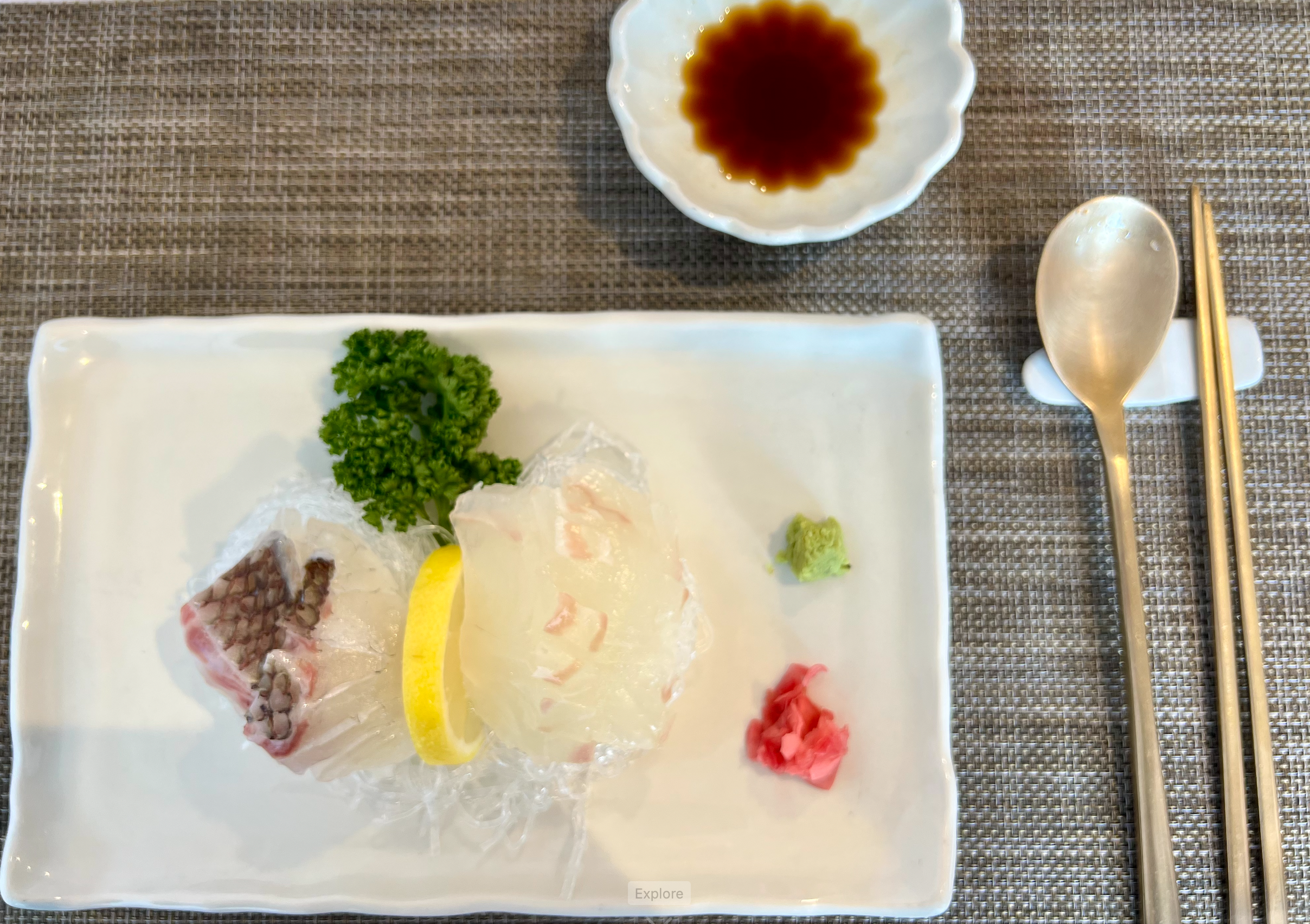 이번에는 두종류의 회가 제공되었습니다. 돔의 가슬가슬한 껍질이 재미있는 식감을 줍니다. 잘 숙성되어 탱글탱글한 식감보다는 보드럽고 깊은 맛을 느낄 수 있습니다.