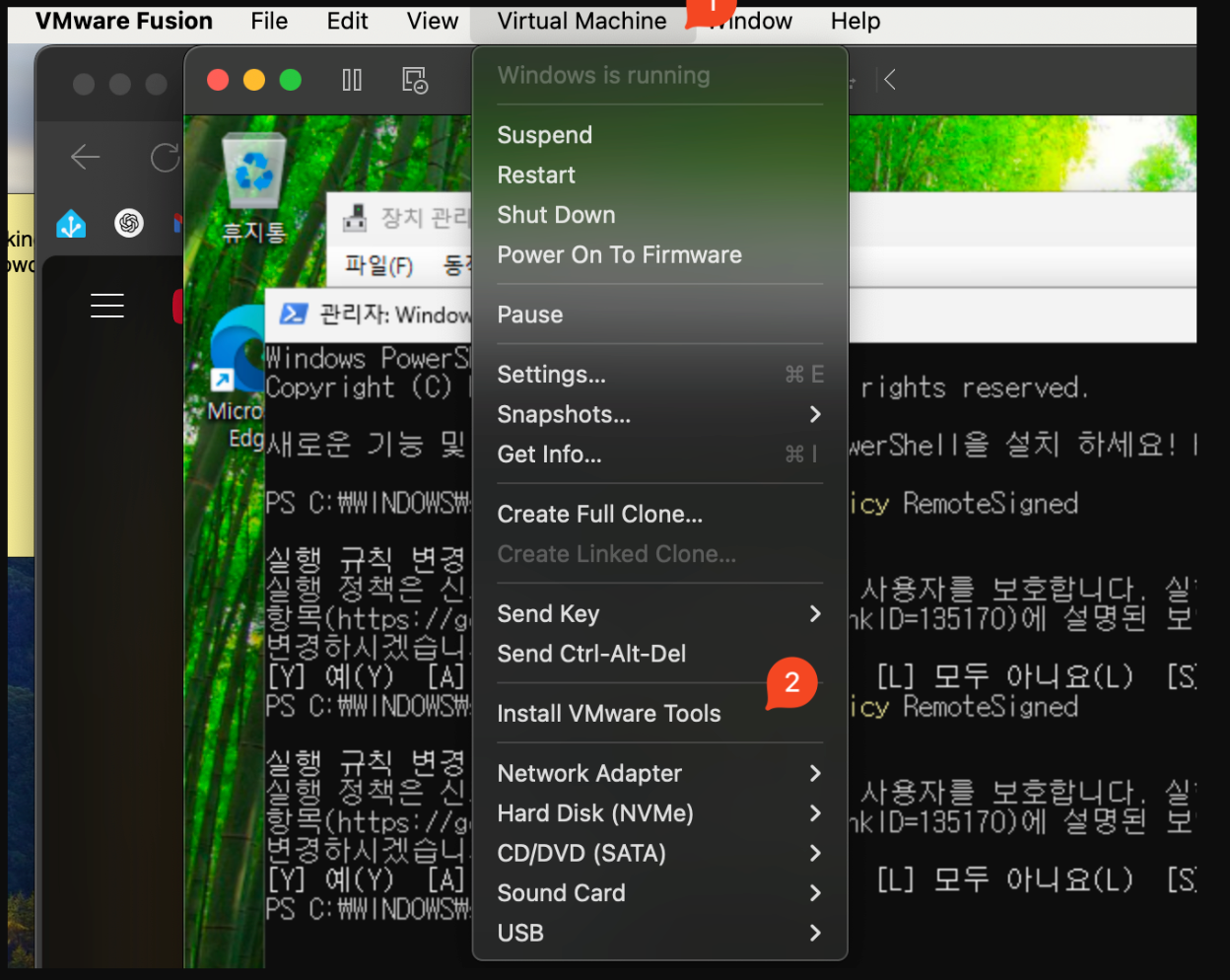 Vmware Fusion의 메뉴에서 Virtual Machine을 선택하고 Install VMware Tools를 선택합니다.