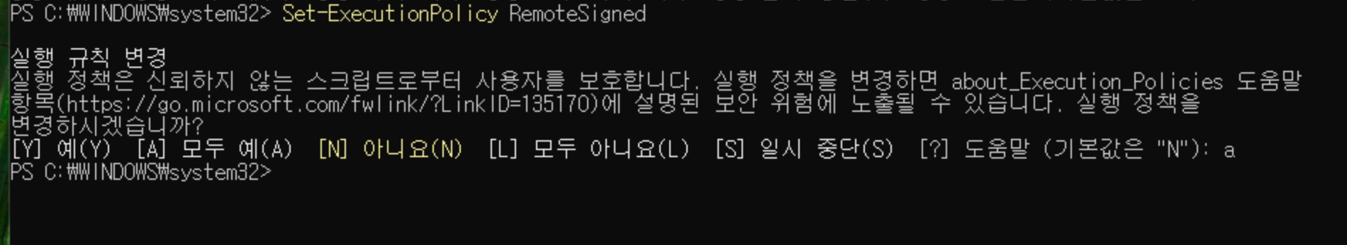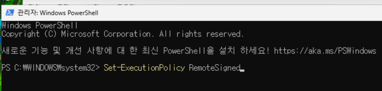 먼저 윈도우에서 파워셀을 관리자 모드로 실행한 후에 다음의 명령을 실행합니다.