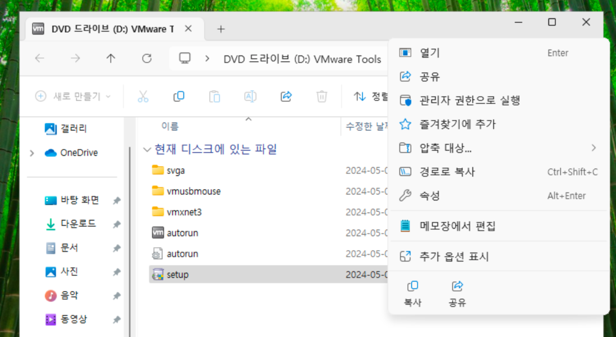 그러면 윈도우에서 다음과 같이 새로운 vmware tools가 담긴 CD가 인식되어집니다. 여기서 setup을 실행하여 설치를 마침니다.
