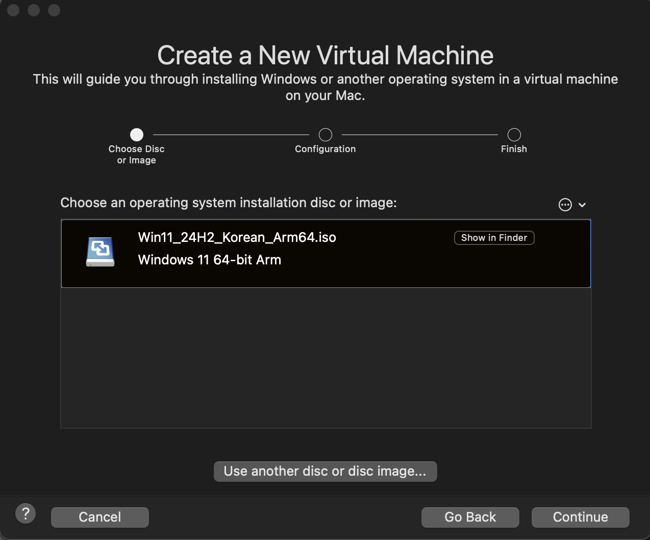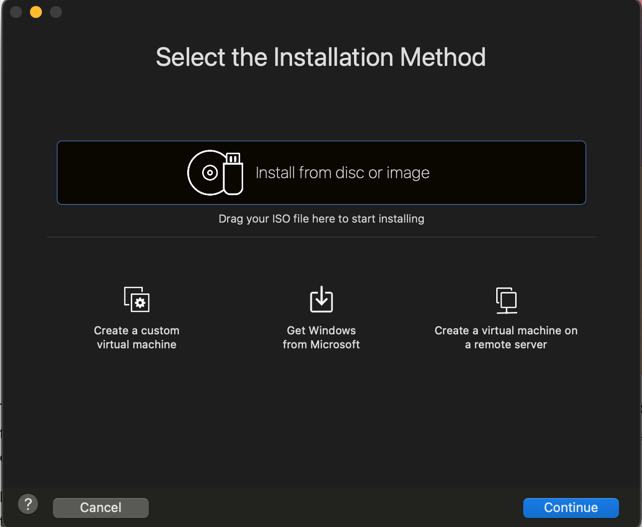 다음과 같이 설치 이미지(iso)를 요구하는 화면이 나타납니다. 다운로드 받은 이미지를 드래그 앤 드랍 해줍니다.