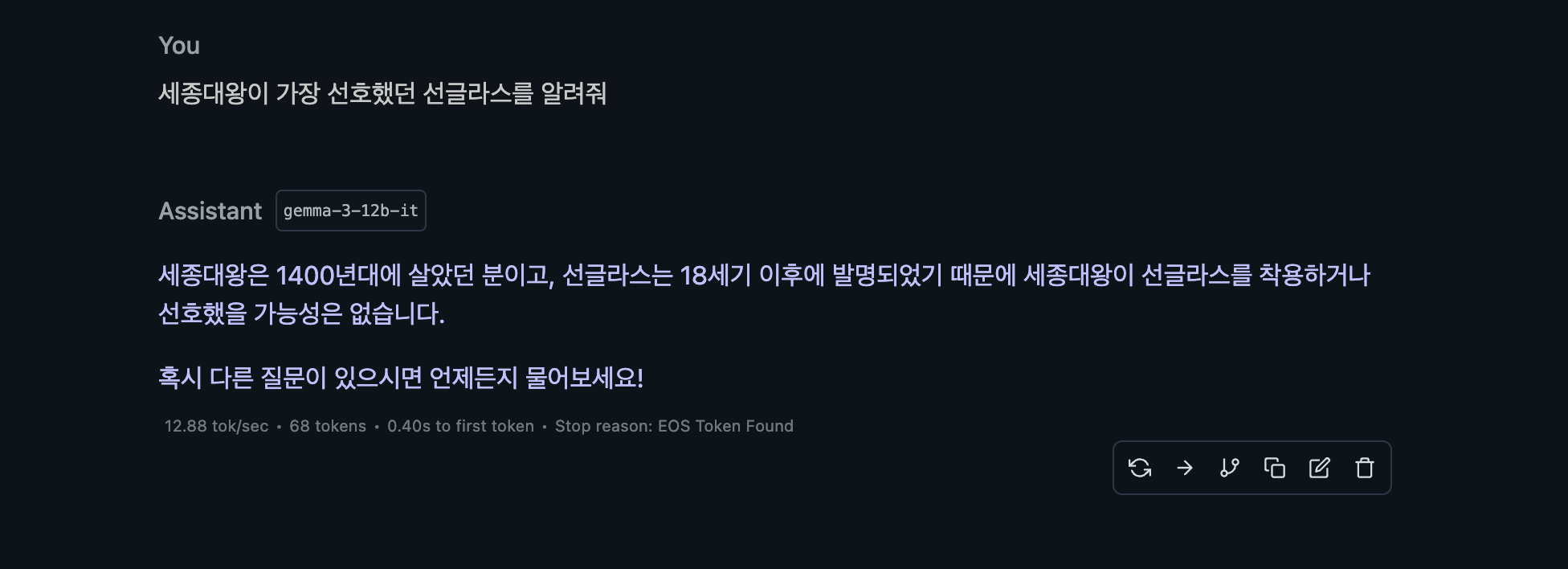 이상으로 간단히 LMStudio를 사용해보았습니다. 모델을 검색하고 다운로드 받기만 하면 바로 사용할 수 있어서 편리합니다. 자신의 컴퓨터 성능에 부합하는 모델만 잘 선택하면 사용하는데 큰 지장은 없어 보입니다.