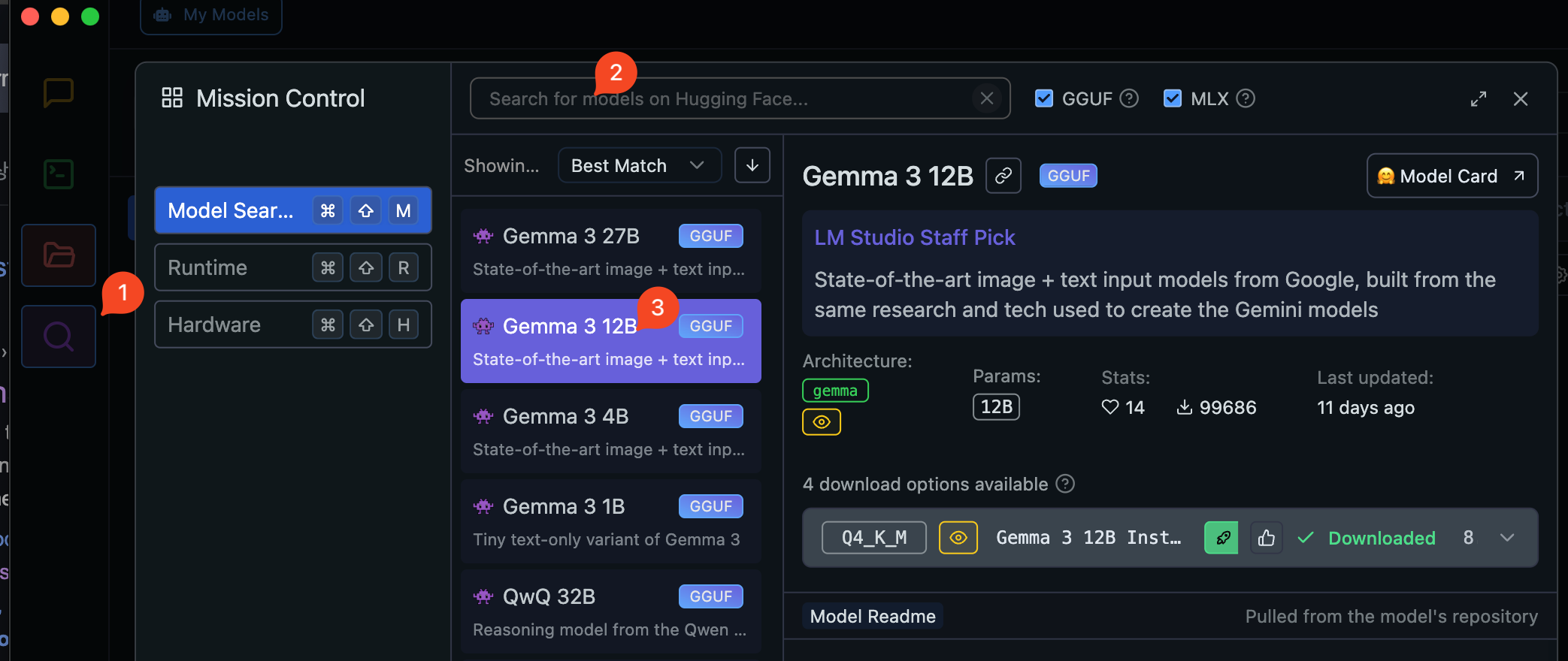 이번에는 모델을 검색하고 다운로드 받기입니다. 좌측에서 돋보기 아이콘을 선택합니다. 원하는 모델을 검색하여 선택합니다. 이번에 새로나온 Gemma3 12B 모델을 선택했습니다.