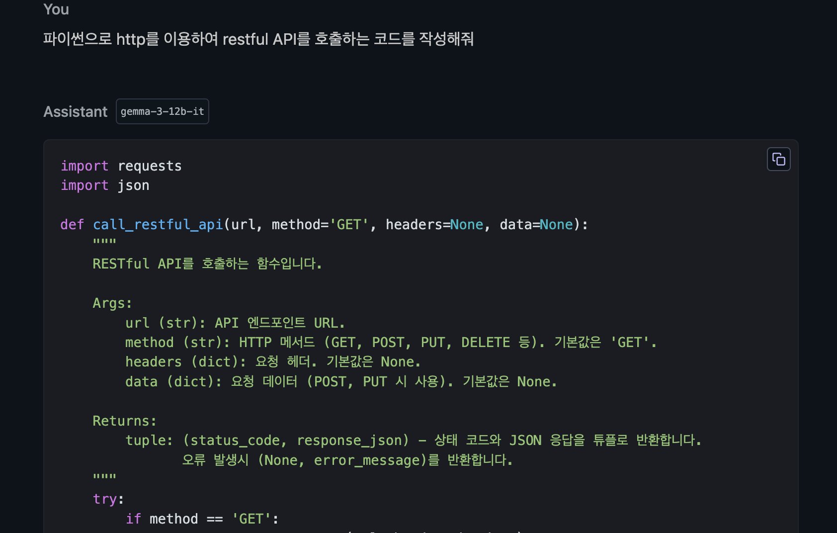 간단한 파이썬 코드 작성을 시켜보았습니다. 잘 작성해줍니다. 하지만 코드 작성은 빠르게 응답하지는 않습니다. 속도는 선택한 모델과 컴퓨터 성능에 따라 달라집니다.