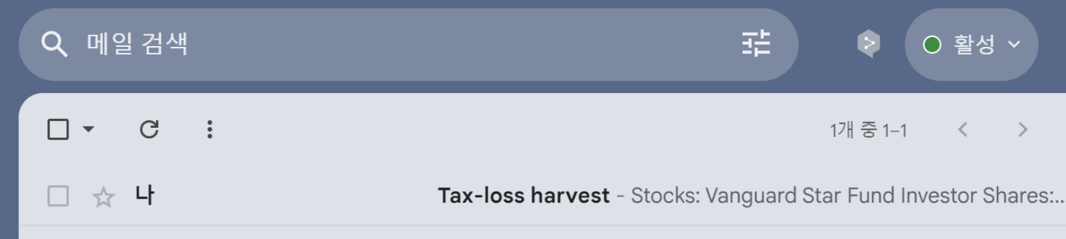 스크립트가 실행되고 이메일이 발송됩니다. 이메일 함에서 Tax-loss harvest 제목의 이메일이 수신되었는지 체크합니다.