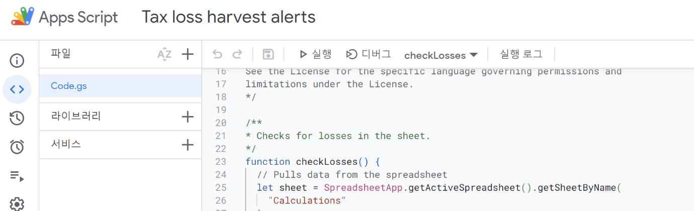 다음과 같이 앱 스크립트 화면으로 이동하게됩니다.