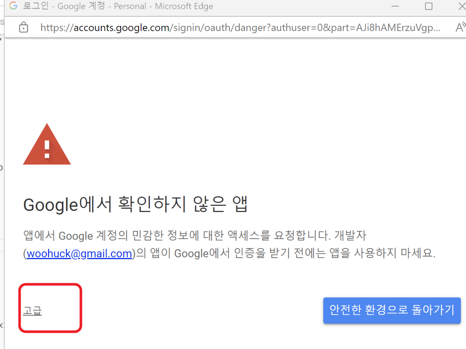 계정 선택 화면으로 이동하게 되고 현재 사용하고 있는 지메일을 선택합니다. 그러면 아래 화면으로 이동합니다. 여기서 고급을 클릭합니다.