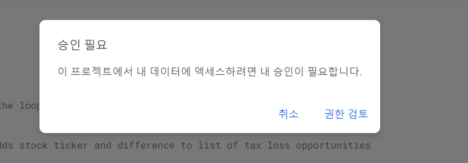 이번에는 스크립트를 테스트 해봅니다. 저장 버튼 우측에 실행 버튼을 누릅니다. 첫번째 실행이기 때문에 권한 요청 승인 화면이 나타납니다. 권한 검토를 선택합니다.
