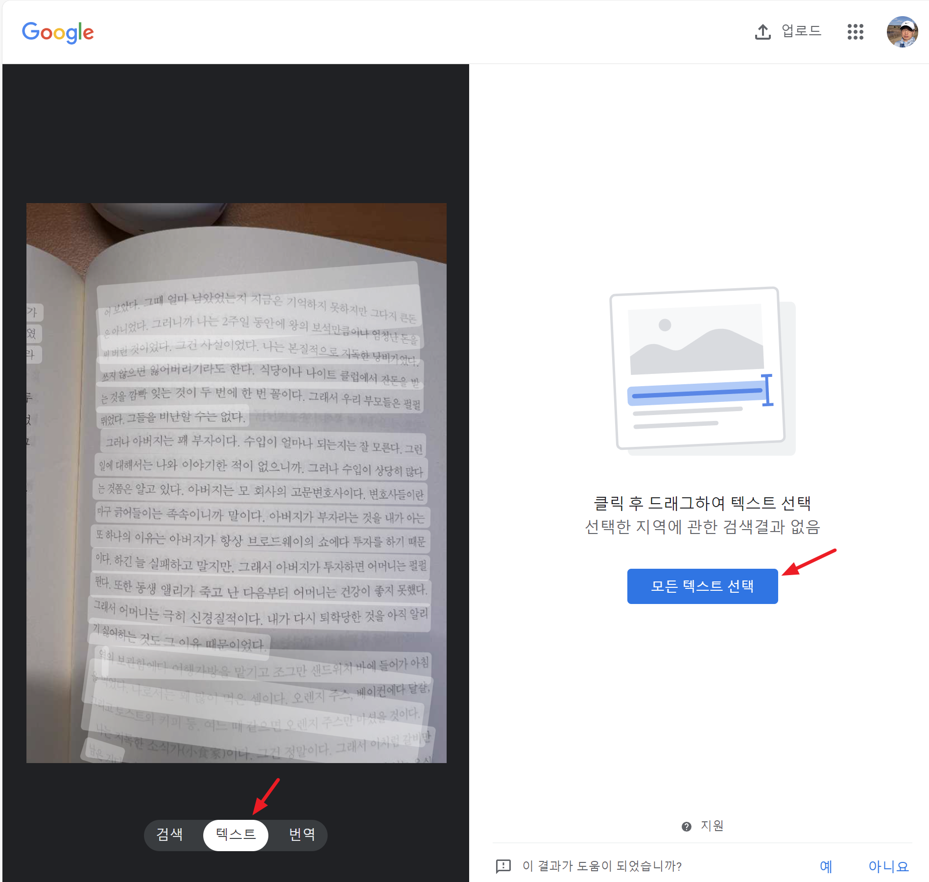 다음과 같이 이미지가 나타나고 하단부의 텍스트 메뉴를 선택하면 원하는 부분을 선택하여 추출하거나 우측의 모든 텍스트 선택으로 전체 글자들을 추출할 수 있습니다.