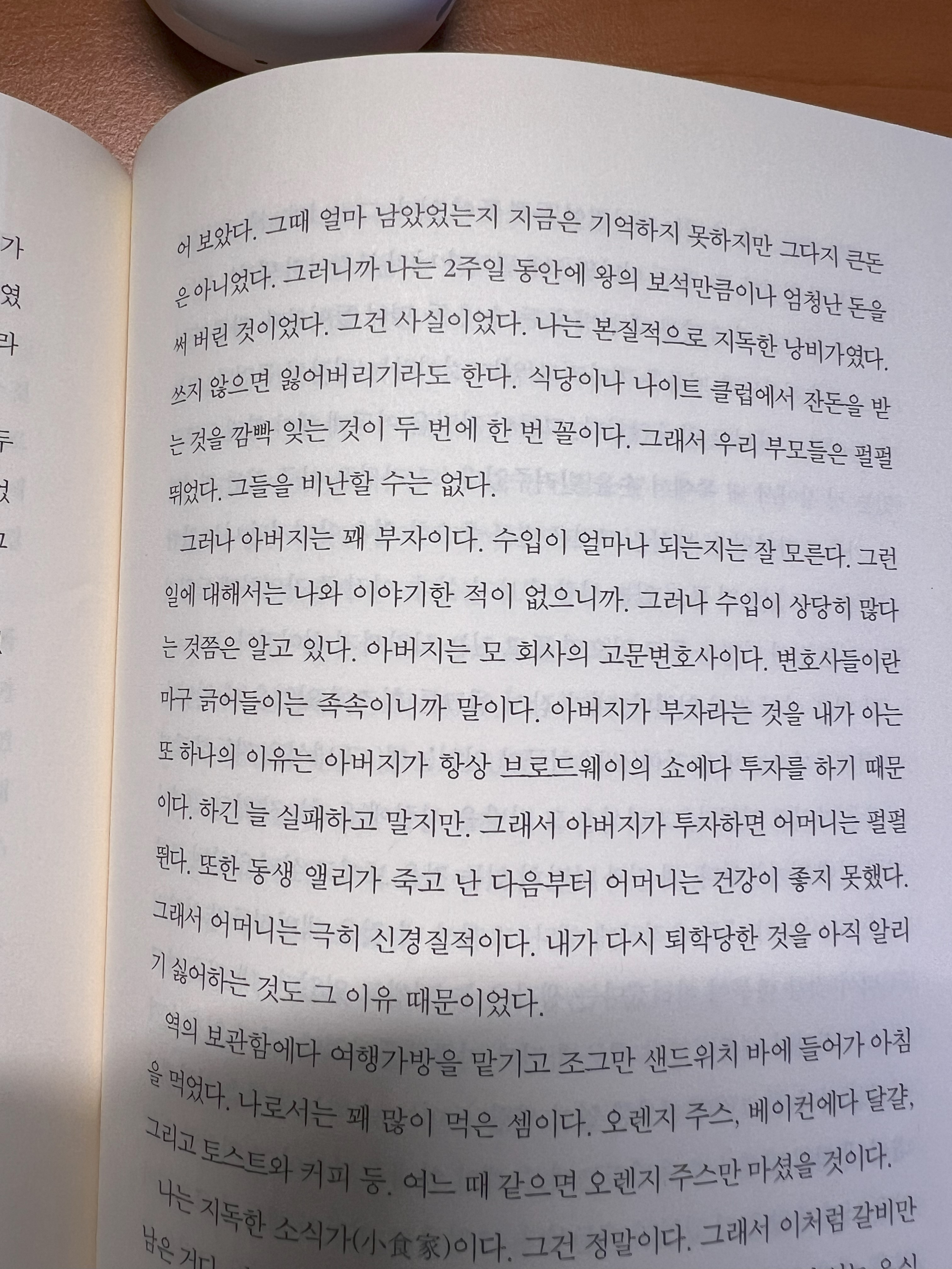 어 보았다. 그때 얼마 남았었는지 지금은 기억하지 못하지만 그다지 큰돈 은 아니었다. 그러니까 나는 2주일 동안에 왕의 보석만큼이나 엄청난 돈을 써버린 것이었다. 그건 사실이었다. 나는 본질적으로 지독한 낭비가였다. 쓰지 않으면 잃어버리기라도 한다. 식당이나 나이트 클럽에서 잔돈을 받 는 것을 깜빡 잊는 것이 두 번에 한 번 꼴이다. 그래서 우리 부모들은 펄펄 뛰었다. 그들을 비난할 수는 없다.