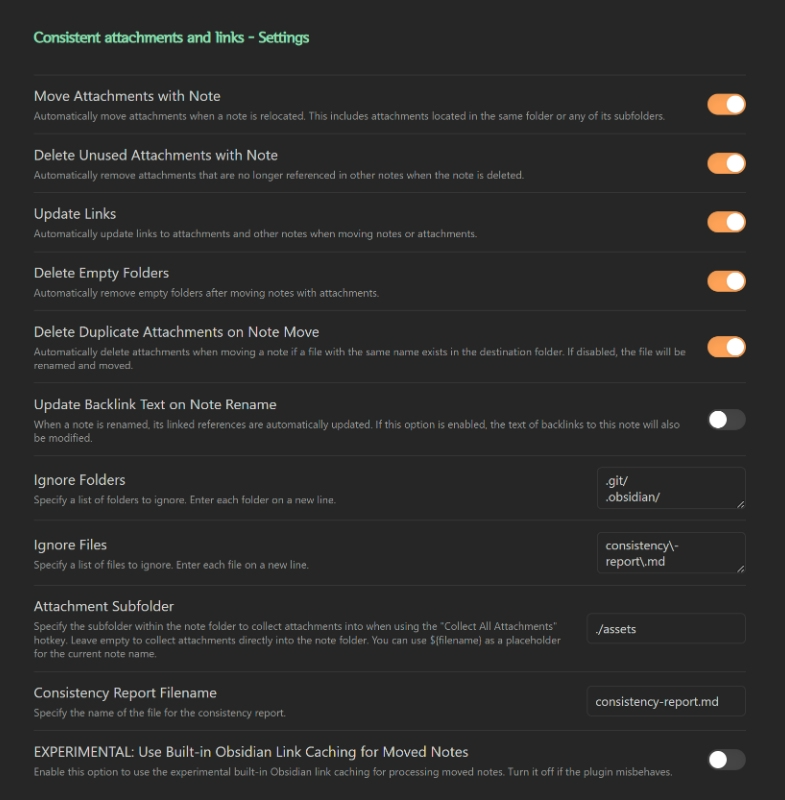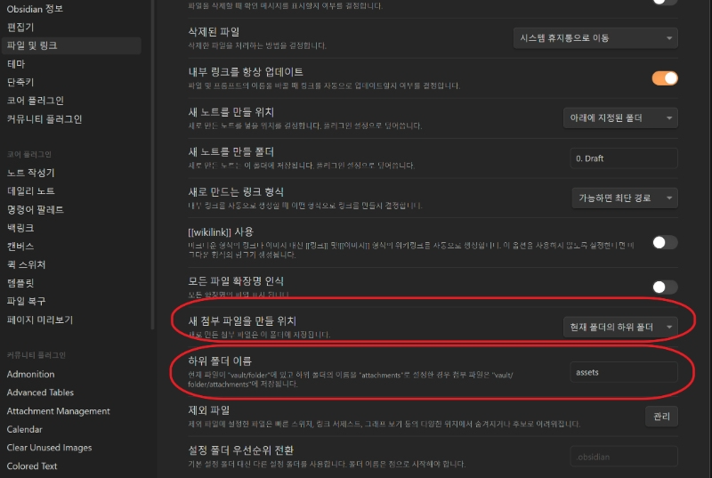 - Attachment Subfolder는 ./assets 으로 설정하였습니다.