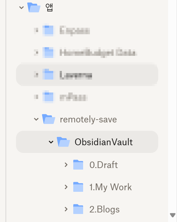 여기까지 정상적으로 진행되었다면 Dropbox의 앱폴더에 remotely-save라는 폴더가 생성되고 하위에 위에서 입력한 볼트이름으로 폴더가 생성됩니다.