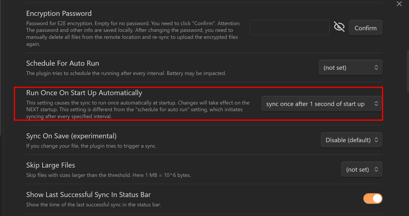 Run Once On Start Up Automatically는 sync once after 1 second of start up으로 선택했습니다. 옵시디언 시작후 1초후에 동기화를 실행합니다.