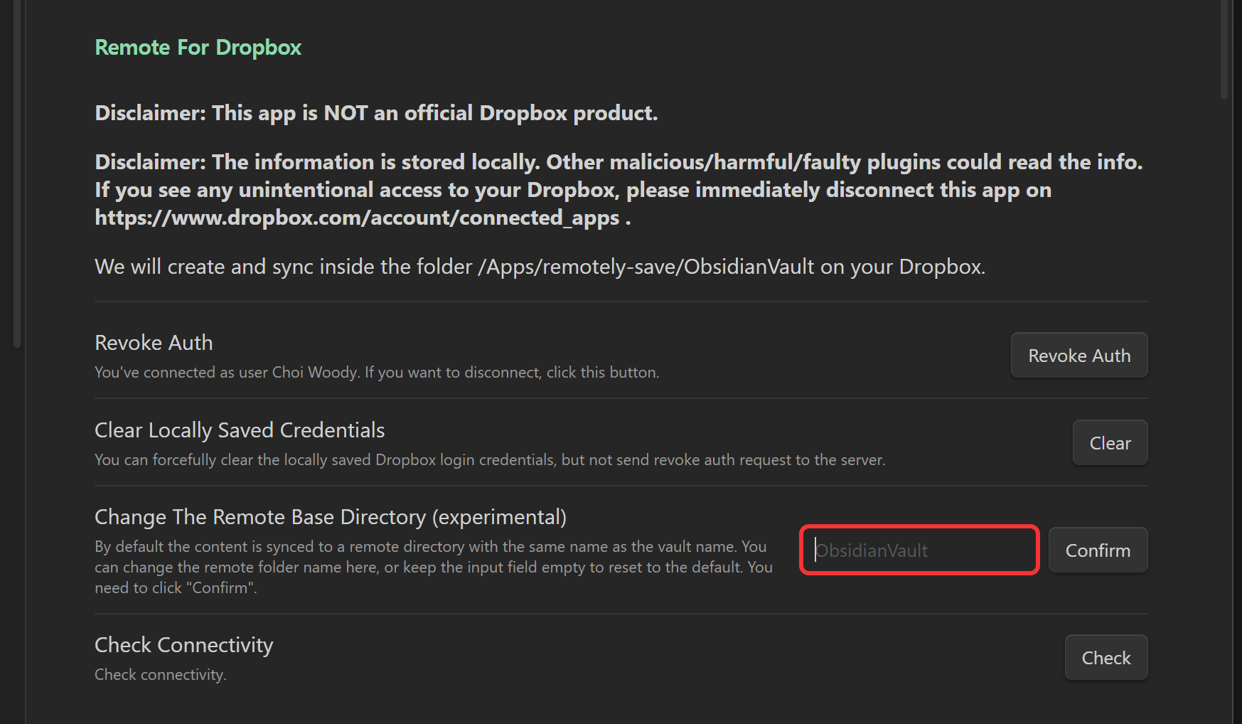 Change The Remote Base Directory (experimental) 항목에서 임의의 Vault이름을 입력합니다. 그리고 Confirm을 눌러줍니다.