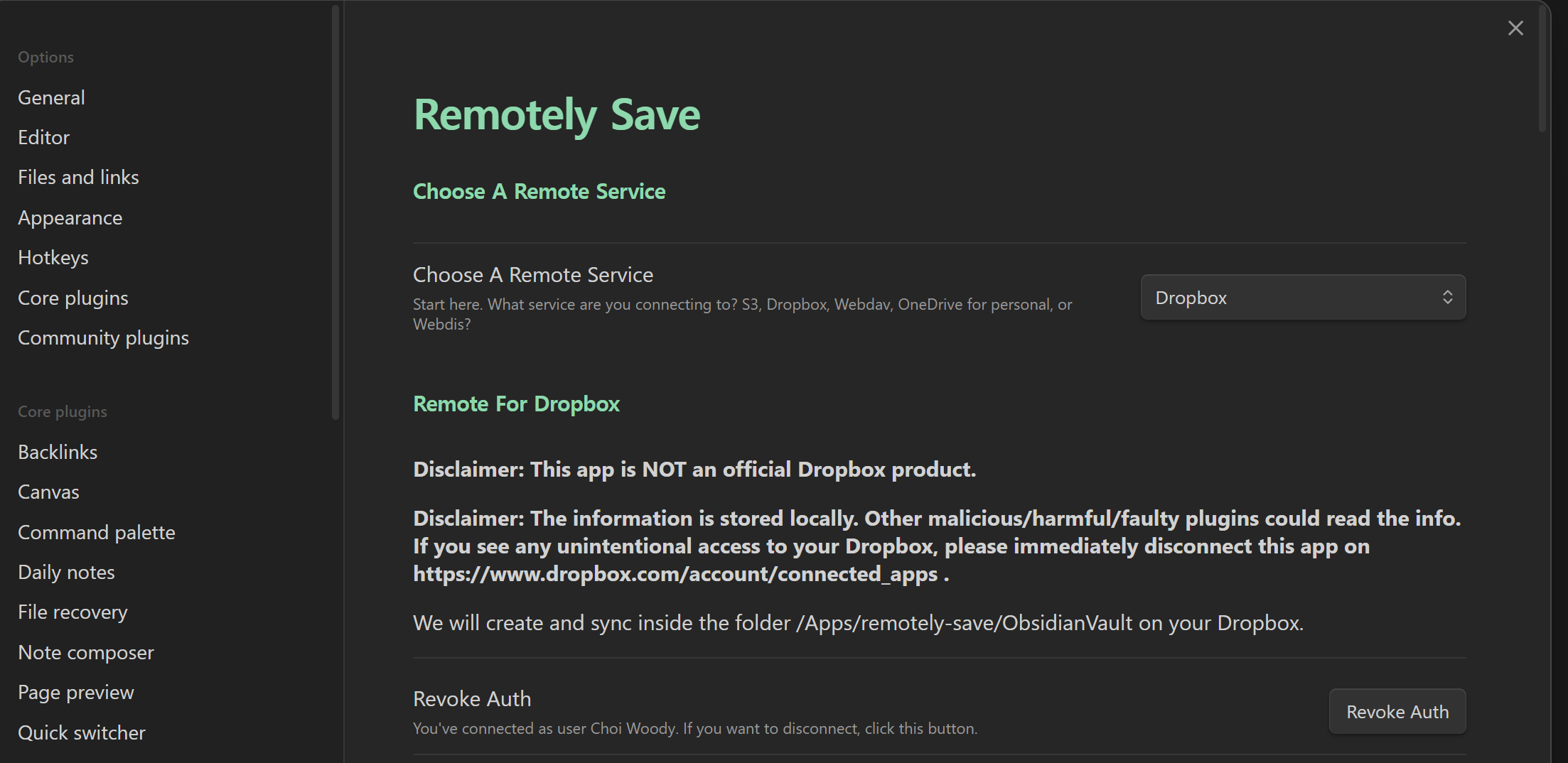 PC에서 Remotely Save 플러그인을 설치합니다. 저는 Dropbox를 이용하겠습니다. 원드라이브도 선택하셔도 됩니다.
