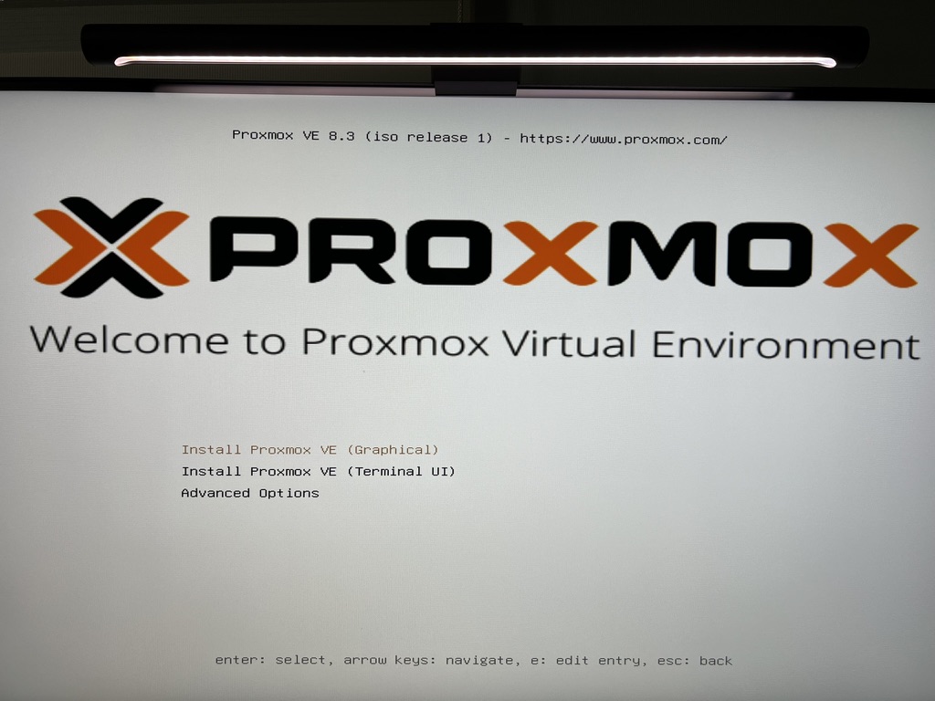 - 부팅하면 다음과 같은 화면이 나타납니다. 첫번째 옵션인 "Install Proxmox VE (Graphical)"을 선택합니다.