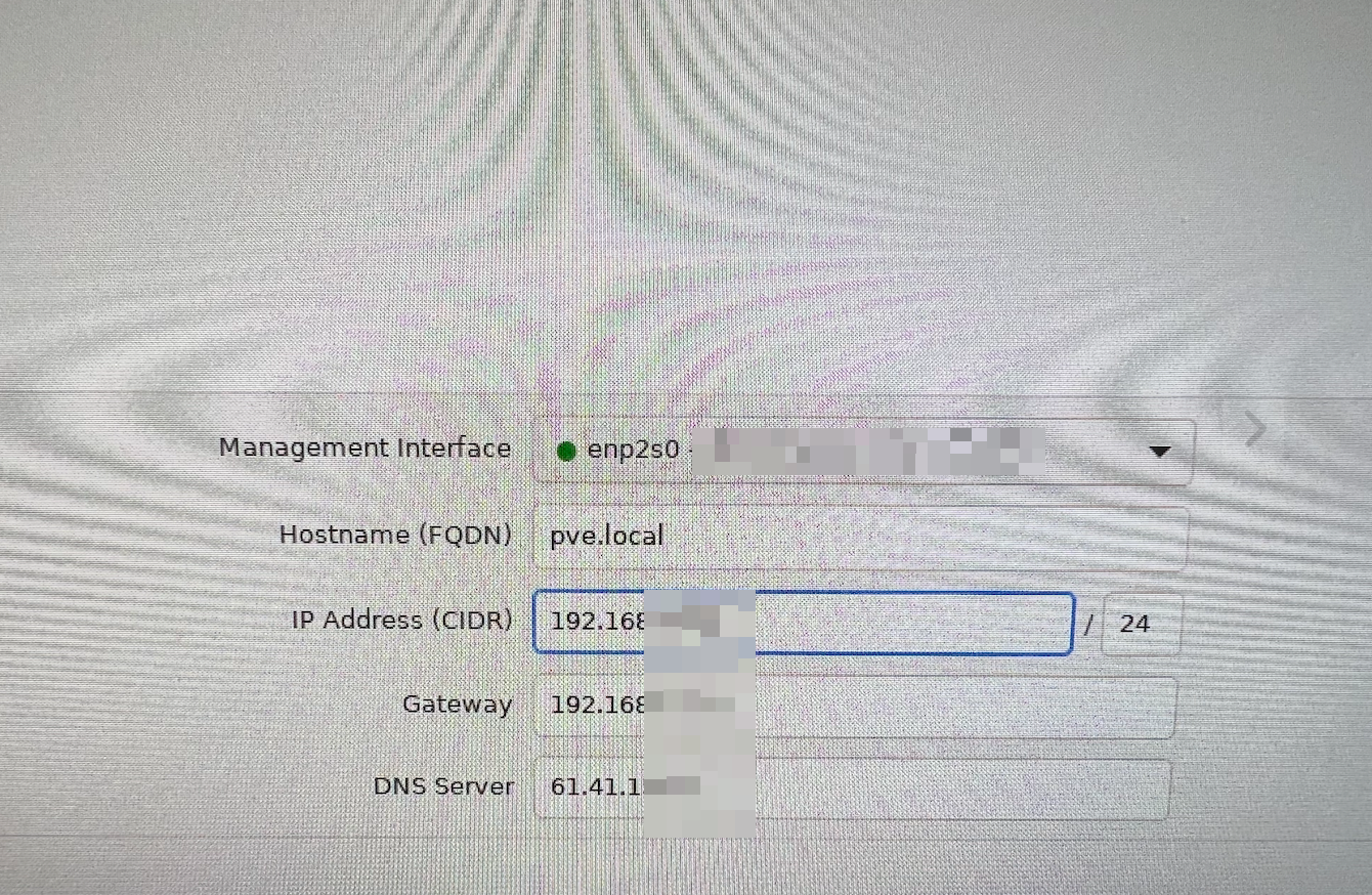 호스트네임은 일단 로컬에서 사용할 목적으로 pve.local으로 설정했습니다. IP address와 gateway는 로컬에서 사용되는 정보를 입력해줍니다.