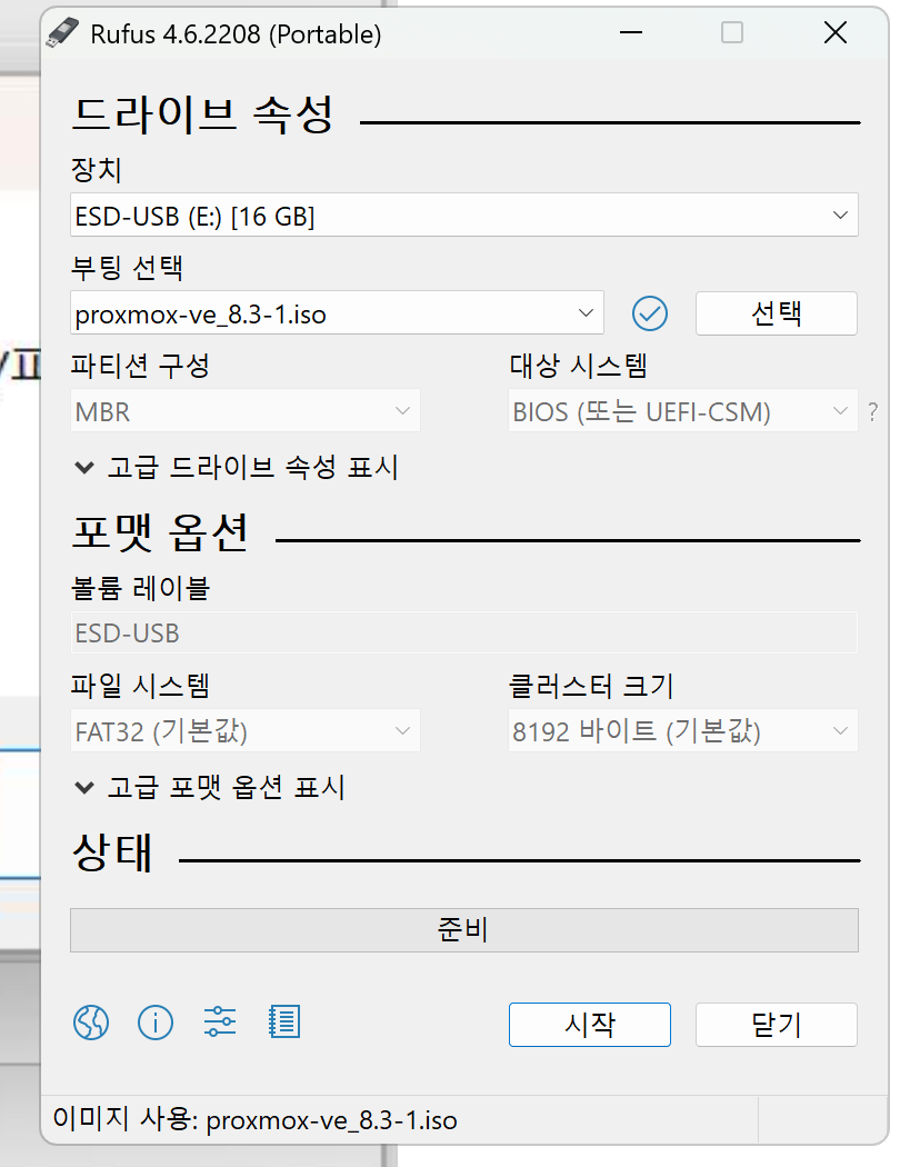 - Rufus에서 iso 파일을 선택한 후에 상태입니다.