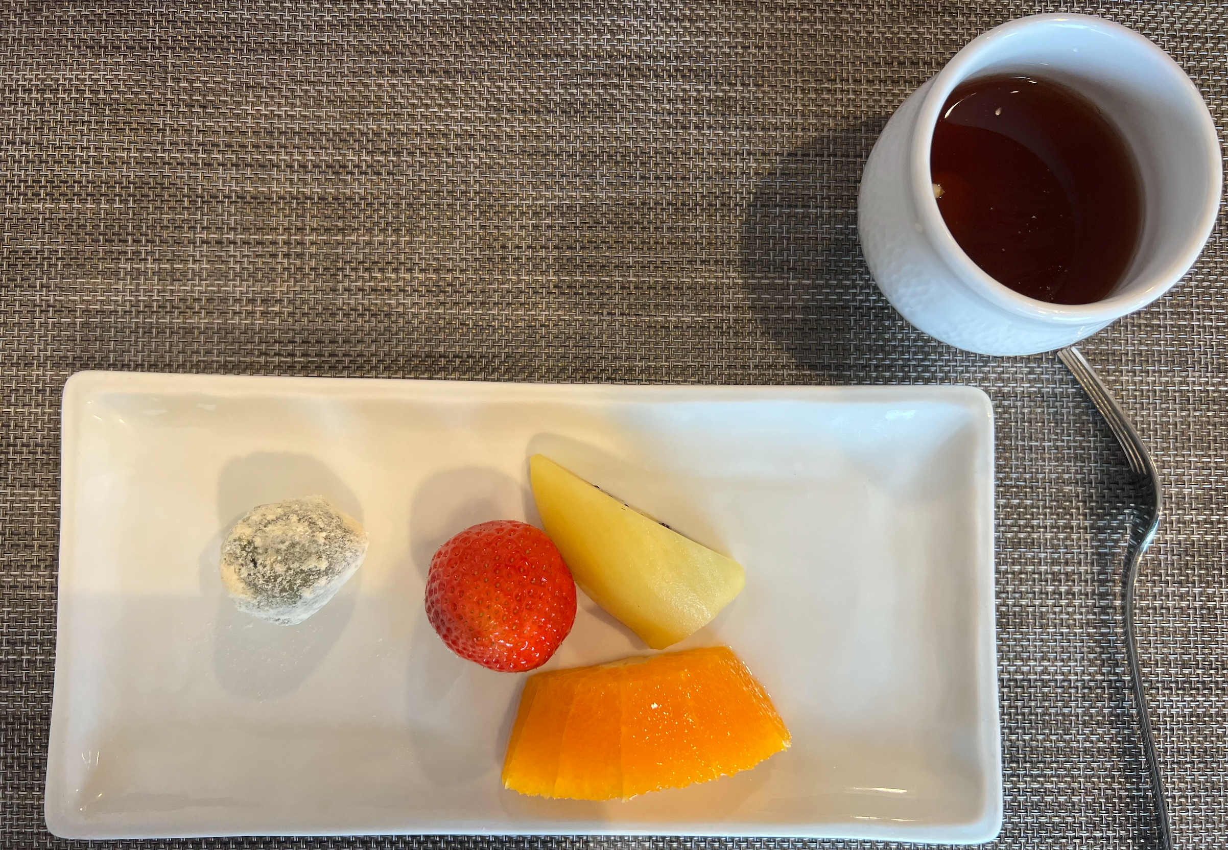 후식입니다. 계피차와 떡 그리고 과일입니다. 떡도 맛있었습니다. 이렇게 먹고나니 배가 너무 불렀습니다. 이미 장어 구이 이후로부터 요리들을 남기기 시작하는 분들도 계셨습니다.