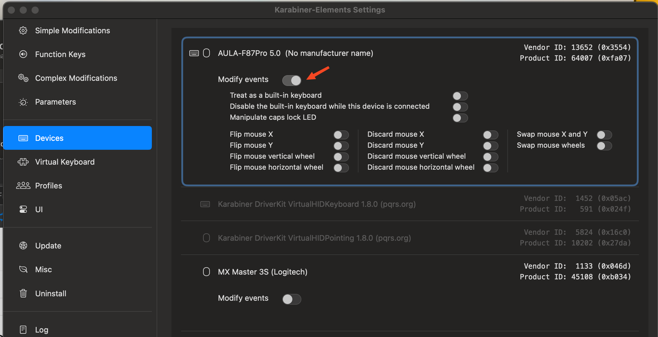 카라비너를 실행 후 Devices 메뉴를 선택하면 연결된 독거미 키보드의 정보를 볼 수 있습니다. 여기서 Modify events를 활성화 해주어야 합니다. 이것을 활성화하면 마치 맥북에 내장된 키보드 처럼 동작을 하게 됩니다. 또한 키맵핑도 동작을 하게됩니다.