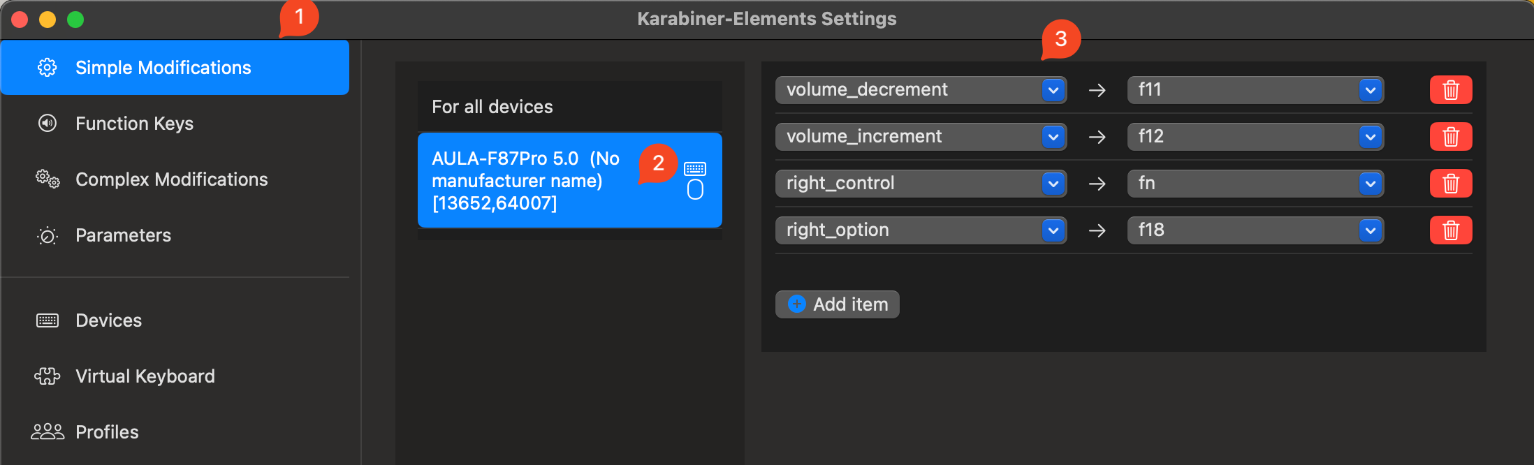 그다음으로는 Simple Modifications 메뉴를 선택합니다. For all devices 대신 독거미 키보드인 AULA-F87Pro를 선택하고 원하는 키맵핑을 시작합니다.
